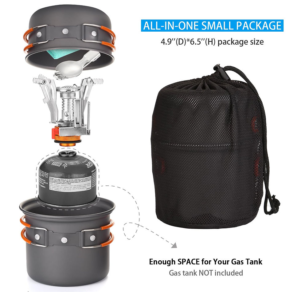 Odoland 6pcs Camping Cookware Mess Kit with Lightweight Pot, Stove,