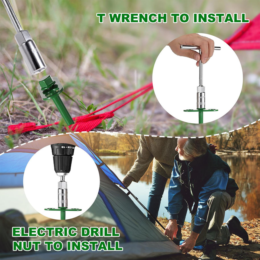 Package Including:4pc Ground Anchors .4pc rubber Protective Cover 1pc electric drill nut.1pc T-shape wrench greatly help you to instal& set up your trampoline & tent easily. Unique Design:360°adjustable double hole connector.1 Ground Anchors can fix 2 tents or trampoline.added electric drill nut Save time and effort in installation. works in a variety of soils Heavy Duty Ground Anchors:Made of premium material steel.Easy to screw in, even in hard ground. Holds its well and doesn’t slip out .worked great to secure your tent trampoline Christmas Decoration.trees RV tent during a pop spring thunderstorm. Widely Used:suitable for Tent, trampoline,rv tents.Inflatable Christmas or hallowen Decoration,even for fix small trees.Swing Sets.easily withstand harsh weather conditions such as heavy rain and strong winds. Warm Tips:If you have any questions please to contact us.(Not suitable for large rocks.May lead to unstable fixation)