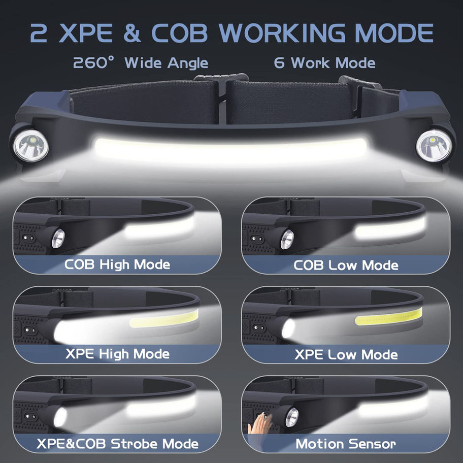 Upgrade Bright Headlamp: The led headlamp features 2 XPE LED spotlights and a COB LED floodlight, offering brighter illumination than the previous version; The COB floodlight above the eyes provides soft, non-dazzling light, while the side spotlights provide enhanced brightness with a range of 500 meters and 260° wide-angle illumination. Perfect for outdoor at night Ultra-Long Standby and Rechargeable: Equipped with a 1500 Li-battery, our headlamp rechargeable provides over 7.5 hours of runtime on a 2.5-hour full charge; The type-C USB charging cable ensures convenient recharging; Plus, the waterproof and dustproof design is enhanced by an anti-dust cap Memory Function and Motion Sensor: The head lamp automatically recalls the previous brightness level and can be turned off after 8 seconds of use; It also features a motion sensor for easy operation; Just activate the sensing switch and wave your hand Multiple Work Modes: Headlamps for adults offer versatile lighting options; The floodlight and spotlights have high and low modes, while a 3-second press of the power button activates the strobe mode for emergencies; All modes can be used with the motion sensor Customer service:If you have want to know the product information and any questions, we will be within 24 hours will reply you