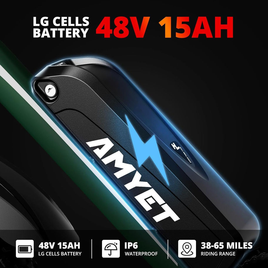 【48V 15AH Battery】The EB26 electric bike for adults has built-in a 48V 15Ah rechargeable and removable Lithium-Ion battery guaranteed a range of 38 miles(full charge about 5h) and 65 miles (max range in PAS mode). 【1000w Brushless Motor】The AMYET EB26 electric bike is powered by a high-speed 1000W powerful motor top speed of 32mph. The peak motor is up to 1500W which provides ample power for climbing hills. 【7-Speed Gears】Professional 7-speed gearing system EB26 electric bike will satisfy all your speed needs for any terrain. A user-friendly shifting mechanism makes it easy to find the right gear. 【Digital LCD Display】The LCD display EB26 electric bike has adjustable speed control from 1-5 levels which provides more powerful data support, such as power display, TRIP/ODO TIVOL/MAX/AVG SPEED, PAS mode, and cruise indicator. Equipped with a USB port to charge the phone. 【26"&4" Fat Tire】EB26 Mountain electric bike With 26x 4-inch fat tires, it can traverse all sorts of terrain, including mountains, snow, beach, rocky roads, and even urban jungles. Lockable aluminum dual shock absorber for less bump on rough roads. The dual mechanical disc brakes deliver optimal durability and safety.
