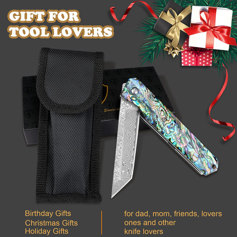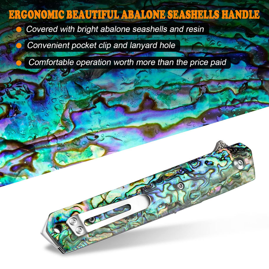 Sharp Damascus Blade: AUBEY Damascus steel blade knife combined with 66 layers of carbon steel and VG10 steel. The folding knife for excellent cutting performance and corrosion resistance, a nice fit, and a finish as a superb slicer for your EDC use or collection Abalone Seashells Handle: The pocket knife is easy to hold. Abalone seashells handle means the Damascus steel Knives are solid, corrosion-resistant, and wear-resistant, with a good grip. On the other side, the pocket clip works well for securing the knife in your pocket Ball Bearing Flipper Knife: Damascus steel knife with a ball bearing in the pivot allows for easy to open. The liner lock safely secures the blade open and prevents unexpected closure Easy to Carry: Weight 4.4 oz, handle length 4.8'', easy to carry. It has a belt loop on the back big enough for the widest belts, even a kilt belt. The pocket knives come with a zippered case for storage Mulit Purpose Folding Knife: Whether outdoor camping, fishing, or as a rescue pocket knife in the car, the survival knife with an emergency glass breaker is your ideal companion for all activities and situations