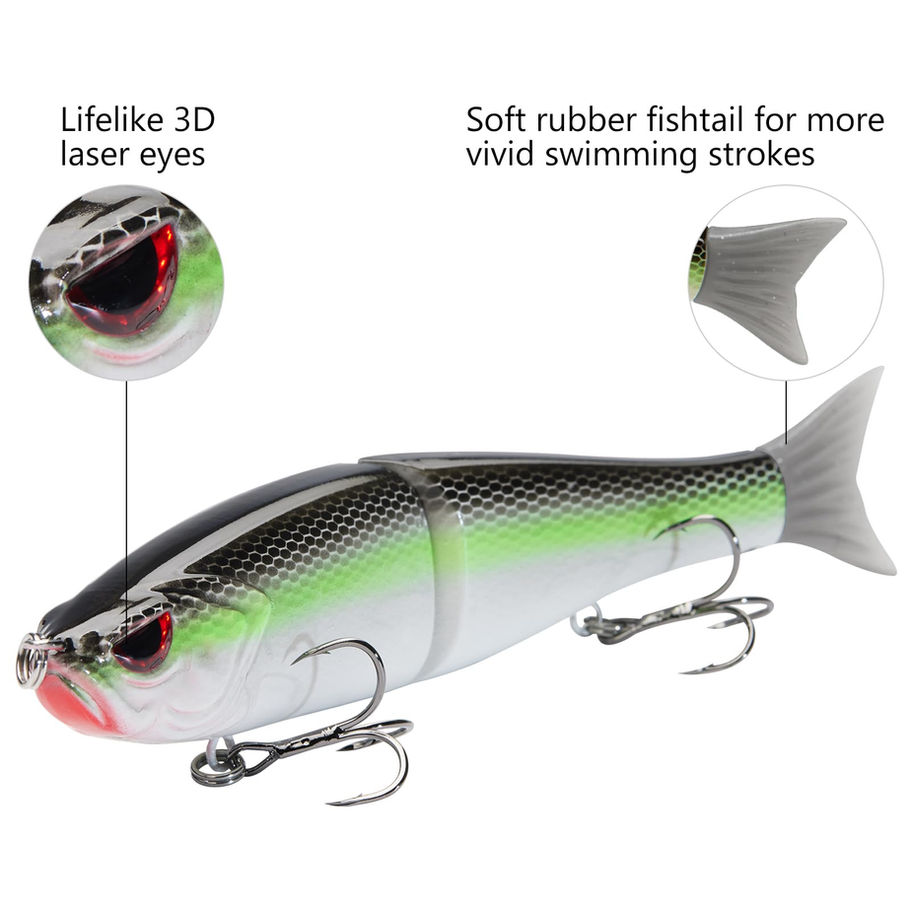 As a slow sinking bait, the bait can be used to attack the entire water column; Single-jointed construction gives it a remarkable swimming motion The glide bait has a unique S-wave action and big profile, and it can be controlled with pauses and reel turns, which can give it more drawing power that appeals to larger fish With eight stainless steel balls (ball dia. 0.43in, 0.39in and 0.28in) built in, along the bottom of the swim bait, to keep balance and for further distance casting, and the steel balls also make the lure noisy which will be a big factor especially when water clarity is low, rather than lure action or color Natural color imitation; Vivid 3D laser eyes; Textured, soft rubber fishtail for more vivid swimming strokes Increases your chances on catching those Monster Bass that simply don’t fall for other baits; Heavily targeted by monster size fish, regardless of their species, Bass, Trout, Muskie, etc.