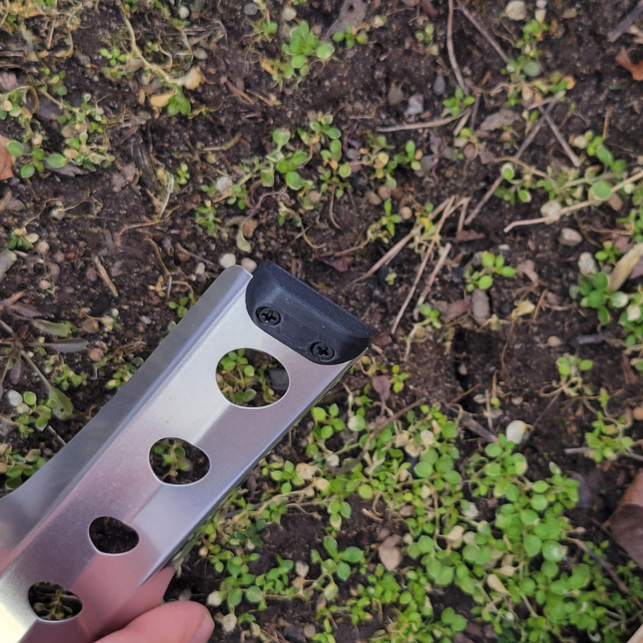Weight: 0.48 oz (13.5g) Ultralight! Weighs less than 3 nickels! Lifetime Warranty Made in the USA End cap provides comfort and digging power, use full force while digging without the handle cutting into your palm Now with cutting teeth on both sides