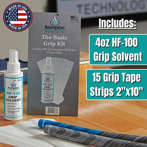 Basic Golf Grip Kit: This basic golf grip kit includes 4oz HF-100 golf grip solvent spray bottle, and 15 (2"x10") premium tape strips. HF-100 Golf Grip Solvent: non-flammable, non-irritating, odorless, and effective on all golf grip tapes. Our golf grip changing kit is made in the USA by Brampton Technology. Premium Golf Grip Tape Strips: The Brampton Golf Grip Kit uses the highest quality 2"x10" golf tape strips to ensure a secure and lasting grip on your golf clubs. The original golf regripping kit: Brampton Technology invented the original golf regripping kit. We've been helping golfers replace their golf club grips for over 25 years. Quality you can trust! Free from Harsh Chemicals: our golf grip change kit is completely free from common harsh citrus chemicals that can cause nausea and allergic reactions. HF-100 solvent is made with high-quality, odorless compounds.