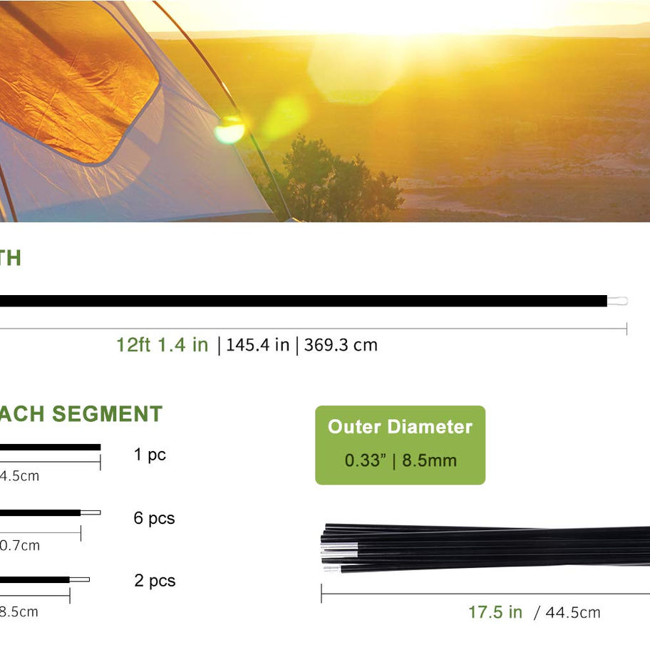 KEY INFO: Total length is 12ft 1.4 in (369.3 cm) including the male tips. OUTER DIAMETER: 0.33 in / 8.5mm. Color: Black. REPAIR OLD TENTS AT LOW COST: With this assembled replacement tent pole, you can bring your old and beloved tent to a prolonged life. And it is much cheaper than buying a new tent or original poles from the manufacture. NO MORE FIBERGLASS POLES: Fiberglass poles tend to crack and have devilish microscopic splinters which are difficult to remove. Replacing them with Aluminum poles before they deteriorate and fail at some inopportune moment can get a prolonged lifespan and eliminate the trouble of buying tent poles frequently. COMPACT & LIGHTWEIGHT: One pole only weighs 0.47 lb, and measures 17.5” long after assembled. You can easily fit the poles inside your panniers or backpack. The shorter segment length and lighter weight mesh well with your motorcycle or backpacking camping needs. WE CARE ABOUT DETAILS: Made of the highest quality 7001 series aircraft-grade aluminum and durable elastic cord, this tent poles replacement can take the bends better than many cheaper poles which would crumple or snap easily. Every pole section is carefully handled for a smooth connection between pole sections for your quick set-up/takedown.
