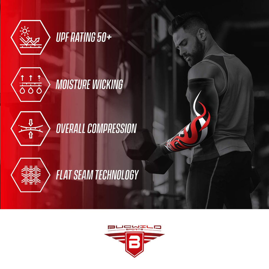 COMFORTABLE COMPRESSION FIT...Bucwild Sports poly-spandex moisture wicking material will keep your arm dry and your muscles warm PEAK PERFORMANCE...Each arm sleeve is engineered to offer mild compression for increased circulation to the arm allowing for faster muscle recovery and decreased fatigue ALL SPORTS...Bucwild Sports compression arm sleeve is perfect for athletes in baseball, football, basketball (shooter sleeve), volleyball, golf, tennis, bowling, running, cross fit, cycling, weightlifting, spartan, as well as those with:, elbow pain, arm pain, soreness, and swelling ***IMPORTANT*** Choose Size That Matches Your Bicep Measurement: Child Sizes:Youth Small (6-7") Youth Medium (7-8”) Youth Large (8-9”) Adult Sizes: Small (10-13”) Medium (13-15”) Large (15-17”) XL (17-19") 2XL (19-21") 100% FREE EXCHANGES - If you order the wrong size we will exchange for a different size at no cost to you. To exchange your arm sleeve simply message Bucwild Sports through Amazon (Note do not contact Amazon customer support for an exchange). We will take care of the rest.