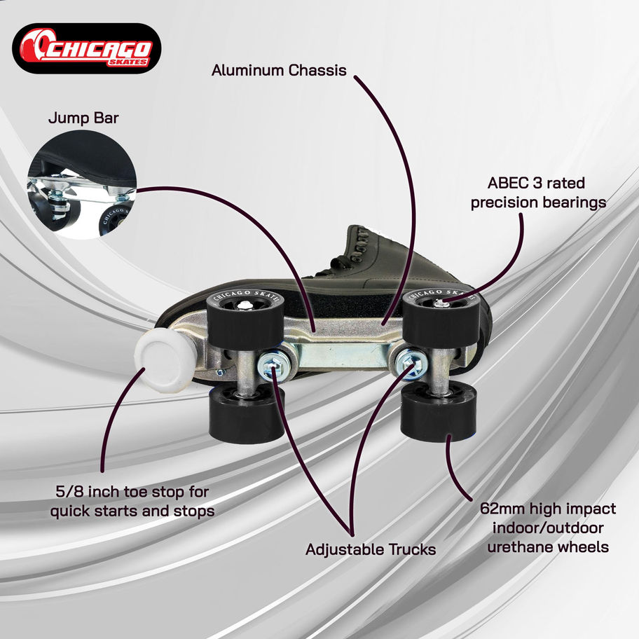 A CLASSIC: This iconic Roller Rink Skate from Chicago is strategically designed for gliding and is also a popular choice for all-around rink and social skating for decades. SUPPORT: The Chicago Rink Skate features a controlled high top for optimum safety as well as high quality laces for maximum protection, leaving your foot comfortable and secure. STABILITY & CONTROL: The urethane wheels hold up well against the normal wear and tear of skating, provide traction and control, and the semi-precision bearings keep you rolling smooth and fast. COMFORT FIT: The skate features a traditional high top profile leather lined boot to support your ankles and a simple eyelet/speed hook lacing system that allows you to adjust the fit as you go. SPECIFICATIONS: Complete with an aluminum base plate with adjustable truck provides easy turning and control as well as wheels suitable for indoor and outdoor skating.