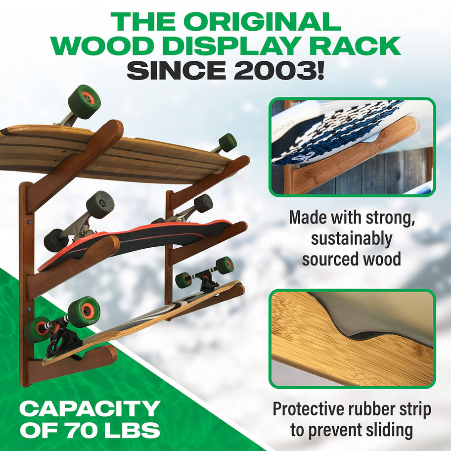DISPLAY AND SHOWOFF YOUR PASSION: Cor Surf wall mount rack is display and storage space for your prized surfboard, longboard, wakeboard, snowboard, skateboard or kite board. Go on, let your gear take pride of place! BEAUTIFULLY CRAFTED: Cor Surf skateboard rack is made from solid, eco-friendly dark stained wood or bamboo that will blend effortlessly into any existing interior design while balancing sustainability and durability. THOUGHTFUL, VERSATILE DESIGN: the surfboard rack features protective soft rubber strips that prevent your board from scratches and dings. When you remove the center arm, you also have the versatility of displaying your board upright like a piece of art. Why waste money on posters and paintings when you can display your characterful surfboards? DIMENSIONS OF COR SURF WAKEBOARD RACK WALL MOUNT: (height) 24"; (length of each arm) 14"; (distance between each arm) 7"; all mounting hardware included for easy installation. COR Surf is a family run company based out of Huntington Beach, CA. We've been making premium board racks and waterports accessories since 2003!