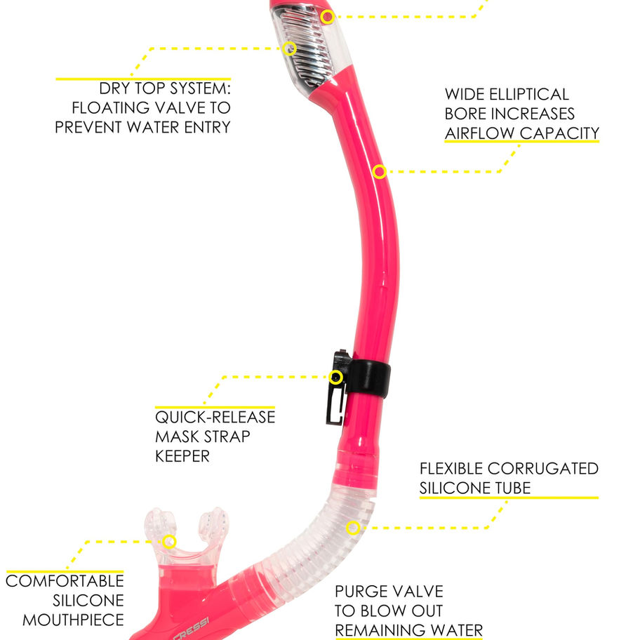 The F-Dual & Tao Dry is a perfect combination of 2 quality products for enjoying snorkeling without any issues. The F-Dual is a single-lens mask featuring a unique assembly of lens and skirt without a frame and a wide field of view. The low internal volume allows for effortless clearing and the quick-adjust strap buckles are molded directly into the skirt for a flexible fit and reduced drag. The Tao Dry is a Dry top design snorkel, where the special valve seals tube when submerged. Snorkel with top splash guard designed to reduce water intake and bottom purge valve for easy draining. Mouthpiece made of soft silicone ensuring comfort and reducing jaw fatigue. The F-Dual and Tao Dry are designed in Italy by Cressi and made in Taiwan. Cressi has been an Italian brand pioneer in scuba diving, snorkeling, and swimming equipment since 1946.