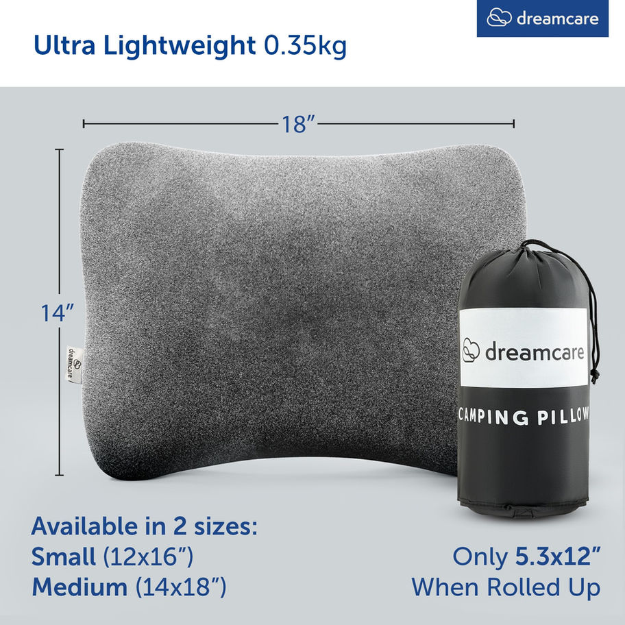 Lightweight and Compact - Dreamcare Camping Pillow's lightweight and compact design makes it easy to carry around on all your adventures. It easily rolls up to fit into the included water-resistant bag, making it a great addition to you camping accessories. After unrolling the pillow, simply shake it out so that the memory foam spreads out evenly. Perfect Fit for Your Neck and Shoulders - Sleeping away from your own bed can often cause strain on the neck and shoulders. This small pillow is ergonomically designed with a unique hourglass shape that contours perfectly to the curves of your neck and shoulders. The unique shape provides optimal support, making it ideal for all sleeping positions. Super Soft and Comfortable - Crafted with premium memory foam, this small camping pillow provides the ultimate sleeping comfort. The memory foam pieces can be moved around to suit your individual needs and preferences. It comes encased in a soft microsuede cover, ensuring a cozy and luxurious feel. Easy to Clean - Enjoy hassle-free cleaning with our travel pillows. The removable cover is machine washable and dryer-friendly, making it convenient to keep your pillow fresh and clean. Our camping pillows for sleeping are OEKO-TEX and CertiPUR certified, ensuring that you are sleeping in a healthy and safe environment, even when away from home. Sweet Dreams Everywhere You Go - Turn your campsite into a comfy haven with Dreamcare's Camping Pillow. Available in three classic colors: grey, blue, and green, and two convenient sizes - small (12x16 inches) and medium (14x18 inches) - it weighs only 0.35 kg, making it the ultimate backpacking pillow to add to your list of camping essentials!