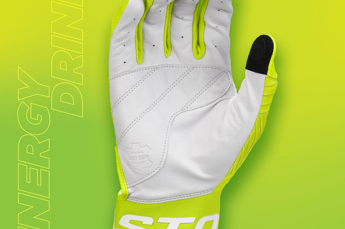 PREMIUM LEATHER PALM | Features a one-piece, tackified full grain leather palm for a thicker, more durable hitting experience. REINFORCED DURABILITY | Includes a double-layer leather palm, offering enhanced durability and longevity for extended use. ERGONOMIC STABILITY | Designed with an ergonomic one-piece neoprene cuff, thumb, and wraparound strap for added stability and a secure fit. STYLISH & FUNCTIONAL DESIGN | The Lycra back-of-hand with Structured-Flex Silicone offers a comfortable, flexible fit and showcases a bold Energy Drink themed design. TOUCHSCREEN COMPATIBILITY | Equipped with a touchscreen-compatible thumb, allowing you to easily use your smartphone or tablet without removing your gloves.