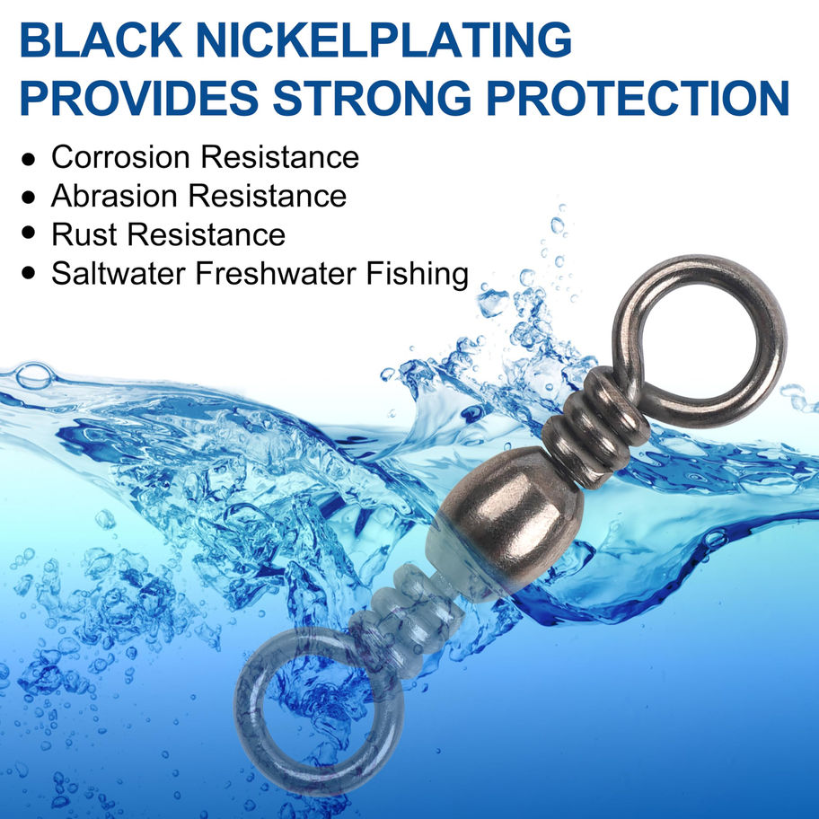 HIGH QUALITY: Barrel swivel made of solid copper and stainless steel with black nickle coated, durable and strong NO TWIST: Barrel swivel allows for smooth rotation; Keeps twisting to a minimum APPLICATION: Great for various rigs and leader. High performance in bass fishing, ideal for freshwater and saltwater fishing VARIETY OF OPTIONS: various size for different situation. Size: 10#,8#,6#,4#,3#,1#,1/0,2/0,3/0,4/0,5/0,6/0. Test strength from 35-165lb Package: 50pcs/100pcs per pack Barrel swivel