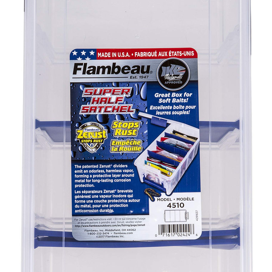 SIZED FOR SOFT BAIT PACKAGES: This tackle storage box is perfect for conveniently organizing soft bait packages. Offers customization options with 3 adjustable dividers that can create up to 4 different compartments. ZERUST ANTI-CORROSION TECHNOLOGY: Exclusive VCI formula infused into the dividers releases a corrosion inhibiting vapor that forms a protective layer on metal to stop rust in extreme marine environments. LASTING RUST DEFENSE: The proprietary Zerust formula inhibits electrochemical reactions that cause rust & corrosion. Provides up to 5-years of protection to keep tackle rust free season after season. EASY IDENTIFICATION DOUBLE DEEP DESIGN: Made with a translucent plastic lid and base for convenient identification of the contents inside, even when closed. Designed with the fisher in mind for quick and organized baiting. SPECIFICATIONS: This Super Half Satchel Soft Bait Organizer measures 15" L x 8" W x 6.25" D. Includes 3 Zerust dividers. Proudly Made in the U.S.A.