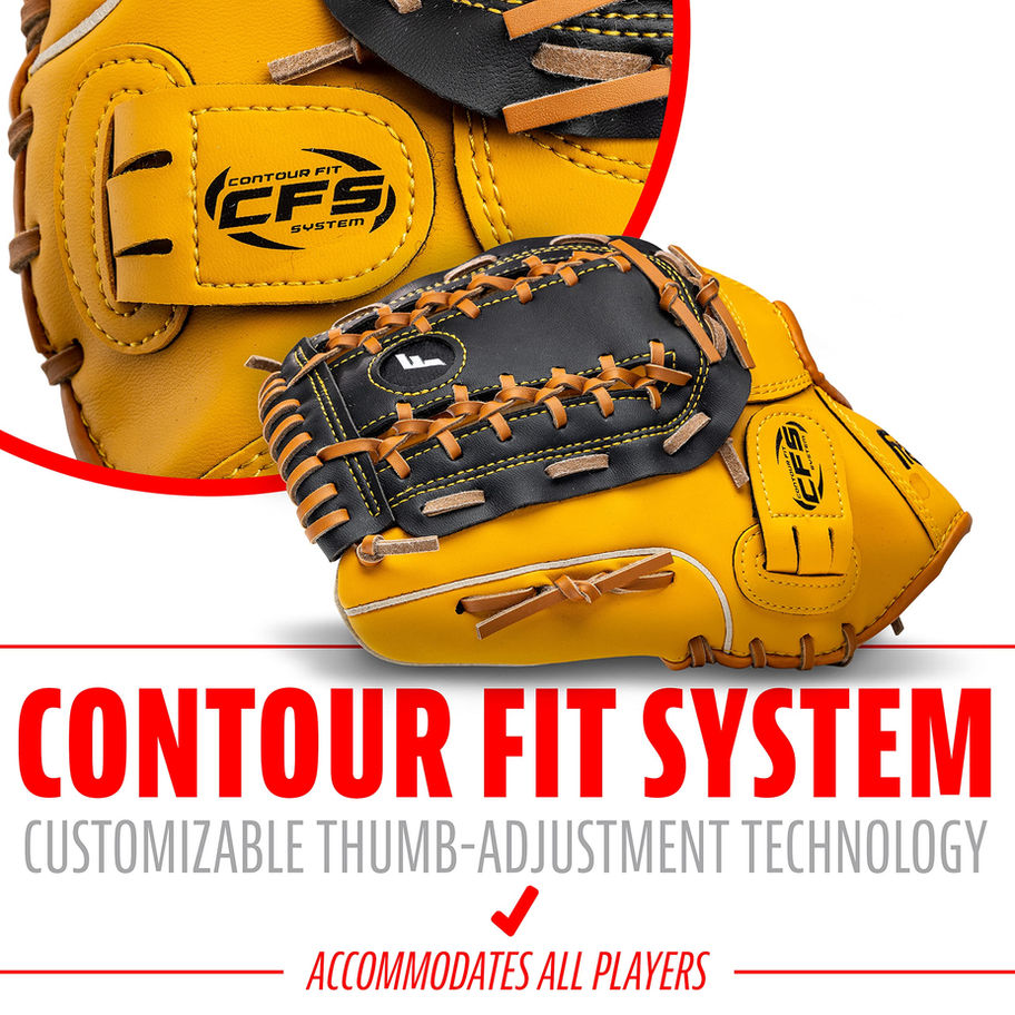 EASY BREAK IN: The soft synthetic leather material is lightweight and responsive making the glove easy and quick to break in so it will be game-ready in no time for baseball, softball, or teeball CONTOUR FIT SYSTEM: Customizable thumb-adjustment technology engineered to expand or tighten to help achieve the perfect snug fit to accommodate all players DURABLILITY: Crafted of a thick, premium synthetic leather designed to mimic the performance and durability of a true leather mitt without the long break-in period HAND FORMED POCKET: The hand formed pocket provides maximum comfort and responsive feel for making scoops and catches without drops NOTE: Left Hand Throw glove = worn on right hand to throw with left; Right Hand Throw = glove worn on left hand to throw with right