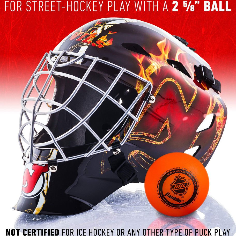 NEW JERSEY DEVILS: With all NHL teams from the U.S. and Canada available, your little goalies can have a blast looking like their favorite players between the pipes! DESIGNED FOR COMFORT: The adjustable backplate ensures a comfortable fit for any youth head size and makes this goalie helmet ideal for all street hockey players CHROME-WELDED STEEL: Specially designed with a chrome-welded steel cage for premium protection during street-hockey games QUICK-SNAP STRAPS: This hockey helmet goes on and off smoothly in seconds, thanks to its easy-to-use quick-snap elastic straps BALL & STREET HOCKEY APPROVED: These hockey goalie masks are not HECC/CSA-certified and are only made for street-hockey play with a 2 ⅝” ball. Not certified for ice hockey or any other type of puck play