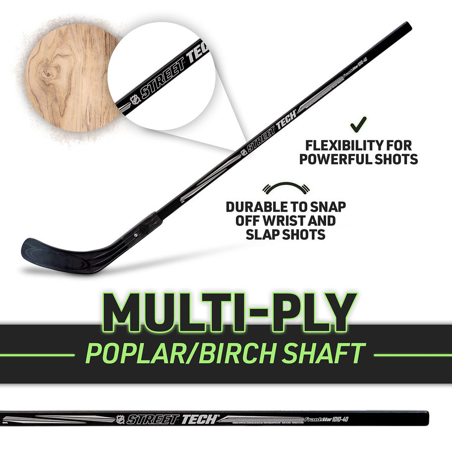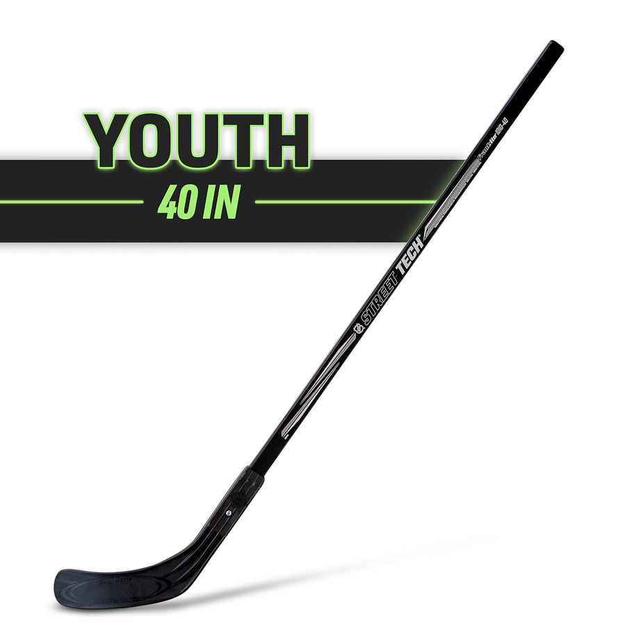 Left shot, 40" Youth National Hockey League License Shaft is a multi-ply poplar/birch Blade is replaceable high-impact polymer Assorted colors