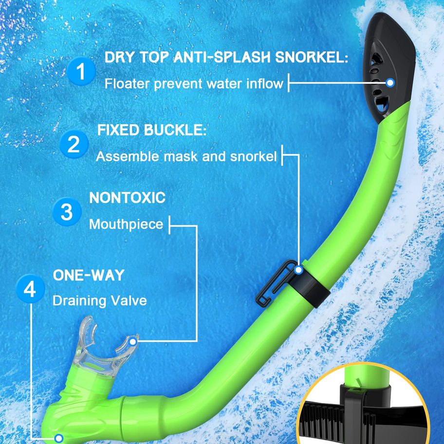 🐬【Dry Top Anti-Splash Design Secures Kid's Safety】Snorkeling Set installs an one-way inhalation valve and has a buoyancy ball on the top of it. Once the tube is underwater, the tube entrance will be closed by the buoyancy ball. NOTE: Please clean sands in the tube carefully before next time use. 🐬【180 Degree Panoramic View and Anti-fog】The lens of snorkel mask is made of tempered glass which can protect against collision. The broad view provides kids a better experience while snorkeling, swimming. 🐬【NO Leaking】The skirt of diving mask is designed with soft and flexible silicone to provide a watertight seal for face. It is comfortable, leak-free while safe for kids to enjoy such a great fun with underwater world. 🐬【For Youth Junior and Kids】Adjusting straps of snorkel mask from 10 inches to 19.6 inches without creeping down in the water by easily pressing this Children Snorkel Set's button buckle. Fitting a range of 4-16 years old children' faces. 🐬【Premium Non-toxic Material】The skirts of diving mask and its mouthpiece is made of premium silicone without an odorous smell. This snorkel set will not make kids uncomfortable and painful. It is durable and easy to clean and especially suitable for long-term usage.