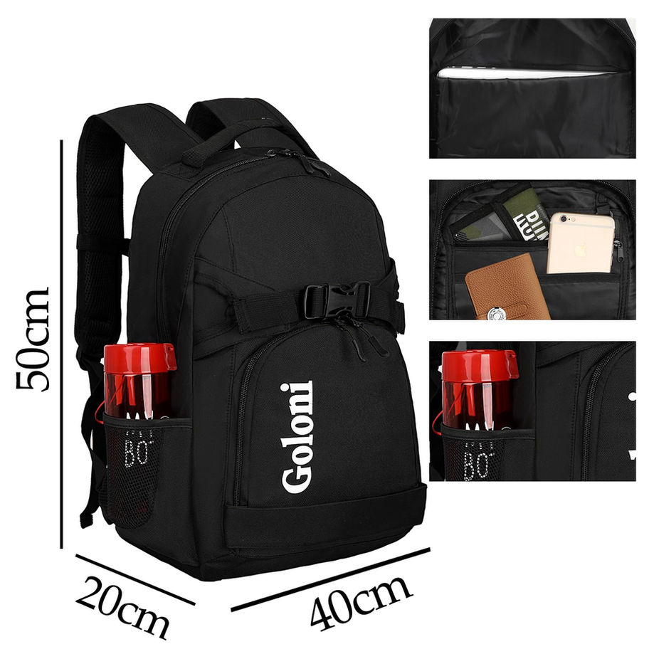 【Product essential details】Goloni Skateboard Backpack Details.Size:20*8*16 inchs,Weight:1.6 pounds.Compartment number:6.Product materials: Terylene.Color:Black,Grey,Blue 【Large Capacity Bag】Different compartments designed for various needs. The main compartment used to bring food/bottle/towels/clothes ect. The hidden main space can put your laptop settle your trip problems.There are 3 small compartments used to suit small items and Skateboard accessories.Adjustable straps hold skateboard or helmet incase slipping out.Two meshs designed for placing water bottles or sports towels on both sides of the backpack,And the top of the backpack is equipped with a fence hook.Lightweight design makes sports more accessible anytime, anywhere with no burden at all.Essential types are more favored by beginners 【Multifunctional areas】Goloni Skateboard backpack is a versatile accessory for travelers, and outdoor enthusiasts. A perfect gift for your loved ones and is essential for travel, commuting, skateboarding, hiking, camping, shopping, and college life. Maximum back support was gived by soft pad. Both of the shoulder straps are adjustable and made by breathable material make sure that your shoulder relax with a long time outdoor activity. The opening of the backpack is a durable stainless material zipper 【Usage scenario and ANTI-Theft】This Skateboard Backpack can not only have a separate laptop compartment, but also holds a skateboard,And you can purchase a mesh pocket hang out for a basketball, volleyball, making it both a laptop, skateboard and basketball backpack. And with a hidden anti theft pocket on the back protect your valuable items from thieves 【After-Sale Service】Customers' satisfaction is our biggest pursuit,if there are any problem with our product, please contact us instantly