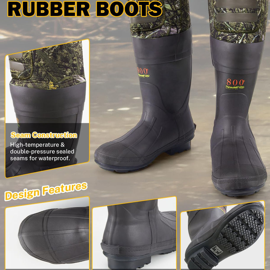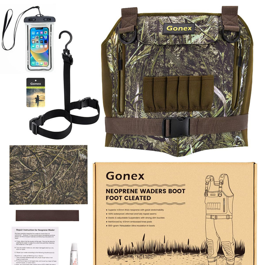 800G Insulated Rubber Boots: Our waders’ boots are built-in 800 Gram 3M Thinsulate ultra insulation, keeping feet warm in cold water. Meanwhile, the vamp is reinforced for toe protection. The heel protrusion makes it easy to put on and take off. The deep tread outsole provides better grip and reduces slipping 4.5MM Neoprene Waterproof & Warm: Gonex chest waders for men and women are made from warm and flexible 4.5 mm neoprene, laminated to polyester jersey and stretch liner. And the hunting waders feature double-stitched sealed seams for enhanced durability and reliable waterproof Multiple Pockets & Storage: Gonex hunting waders come equipped with a chest bullet pouch and an additional shell holder for easy access to ammo. Besides, there are dual-zipper pocket as hand warmer, velcro pocket and flip over zipper pocket for storage, D-rings for clipping gears, and HD transparent waterproof phone phouch for phone usage & protection Humanized Design: Comfortable padded shoulder straps can be adjusted according to your height; adjustable waistband to fit your body; quick-release buckles for easy take it on and off; waist's plain splicing, contrasting color and elastic design for a slim & stylish look; knee reinforcement for protection & wear-resistance Great Gift & Versatile Use: Our waterproof chest waders set includes a shell holder, hanger, phone phouch, repair tool kit, making it an ideal gift for your loved ones. The camouflage fishing waders lock in body heat to keep the user warm in extremely cold weather while hunting, fishing, camping, farming, or ATV riding, etc