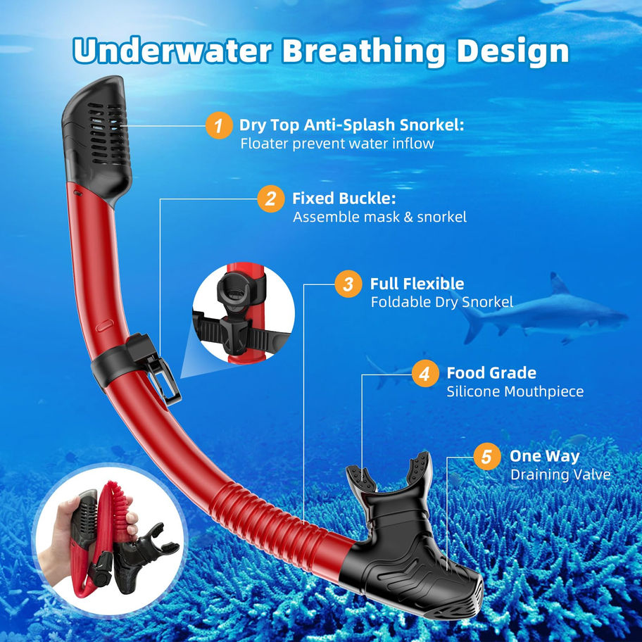 【180° Panoramic Design, Clear Vision Mask Snorkel】 HD durable impact-resistant anti-fog lenses, which can effectively prevent it from fogging up. 180° panoramic design provides you superior views for beautiful underwater adventures. It is the best choice to explore the underwater world cheerfully. 【Ergonomic Skirt Design】 Comfortable silicone edge fits face perfectly without any gap to let water leak in. Adjusting the head strap to suitable location, mask matches the face contour well and it can also create a good seal effect. Fits comfortably with a leak-proof skirt to protect your eyes from water. 【Easy to Breathe Dry Top Snorkel】Snorkel is a key piece of snorkeling equipment that allows you to breathe face down on the surface of the water so that you can stay as much as possible in the magical moment. The top of the snorkel features a floating valve that is completely sealed when underwater, preventing water from entering, and opens on the surface of the water to allow you to breathe easily. 【Diving Mask and Snorkel Tube Set of 2 in 1】The scuba mask + snorkel is the most common snorkeling equipment for adults, suitable for every snorkeling and swimming enthusiast. This snorkeling set is primarily for adults and is suitable for both men and women. The mask and snorkel are used together for snorkeling and diving, and a separate mask can be used for swimming. 【Lightweight and Compact, perfect for a variety of activities】Equipped with reusable bags, it is easy to carry the snorkel set. Lightweight and Compact, suitable for swimming, diving, snorkeling, and many other underwater activities.
