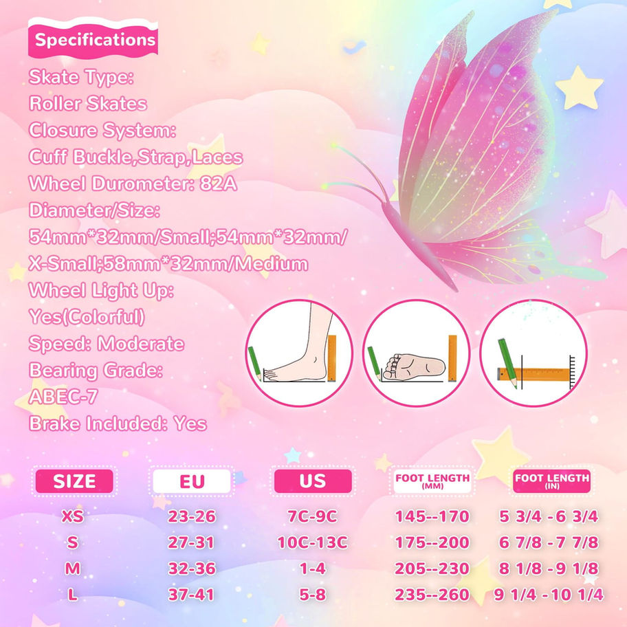 4 Size Adjustable Roller Skates - Nattork roller skates can be easily adjusted to 4 different sizes by adjusting the button.The adjustable size means you don't have to buy new roller skates every few months, making them perfect for kids. Butterfly unique design: The upper design of this roller skates incorporates the elements of butterflies, and the gorgeous butterfly wing pattern shines on the upper, as if every step is showing a beautiful dance. The wheels of roller skates are also unique, whenever skating, the wheels will shine a beautiful light, like flying butterfly wings. Flashing Wheels for Fun - Safe and self-powered wheels, no battery required.Cool colored glowing wheels will excite your kids and make them enjoy the fun of skating. Birthday, holiday, Christmas gifts - develop children's intelligence, exercise children's balance ability. Triple Safety Protection - The safety ratchet buckle, power strap and laces up closure system help fasten the feet properly into the skate and create an additional wrapping effect when using our roller skates. Skates come with upgraded brakes that help your child brake when needed to prevent collisions. High Quality - Equipped with mute ABEC-7 bearing, PU flash wheel, safety limiter, so that your child can enjoy a smooth and happy sliding experience.