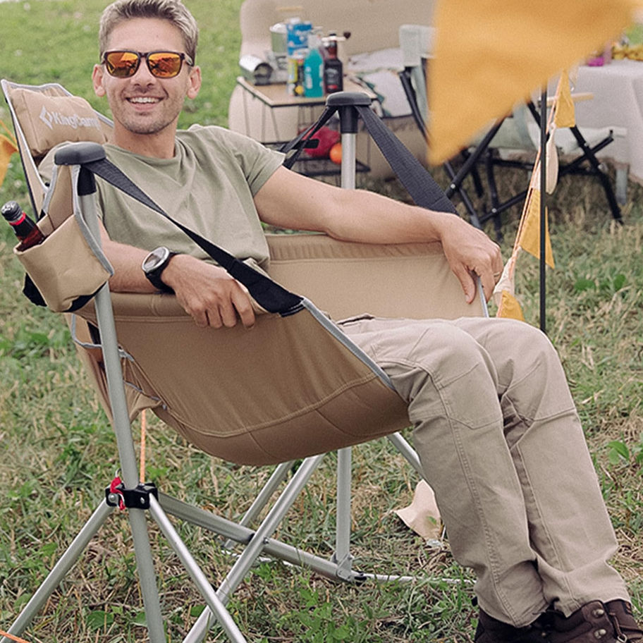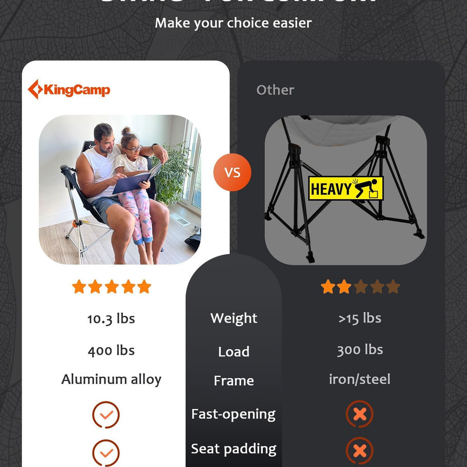 HAMMOCK CHAIR: New hammock camping chair style, you can freely sit or recline. Adjust the strap, your can find perfect back angle. The rocking camping chairs for adults allow you to sway in the wild without long ropes and trees. STURDY: Differs from normal steel frame, KingCamp swinging camping chair adopt high-strength 6063 aluminum alloy combine with bold steel, much more solid but lighter. Triangle cross support increasess the stability. Swing easily. OVERSIZE: KingCamp folding hammock chair is 37.4"x29.5"x49.2", you have roomy seat area to wiggle around unrestricted, and high backrest can fully support your back. 22.8" off the ground, the portable rocking chair is perfect for adults to stretch legs freely. OPTIMAL COMFORT: Durable padding fabric with mesh, the swing camp chair is not only soft and comfortable, but also breathable. Padded pillow supports your head. Padded hard armrest, comfortable and help you easily get in and out. Enjoy the ultimate comfort. EASY TO FOLD: Integrated frame, quickly set up and fold. Weighs only 10.3 lbs, easy to carry and storage with included carry bag. The folding camping chairs is perfect for camping, beach, concerts, sports game, or you can enjoy leisure time ar your yard.