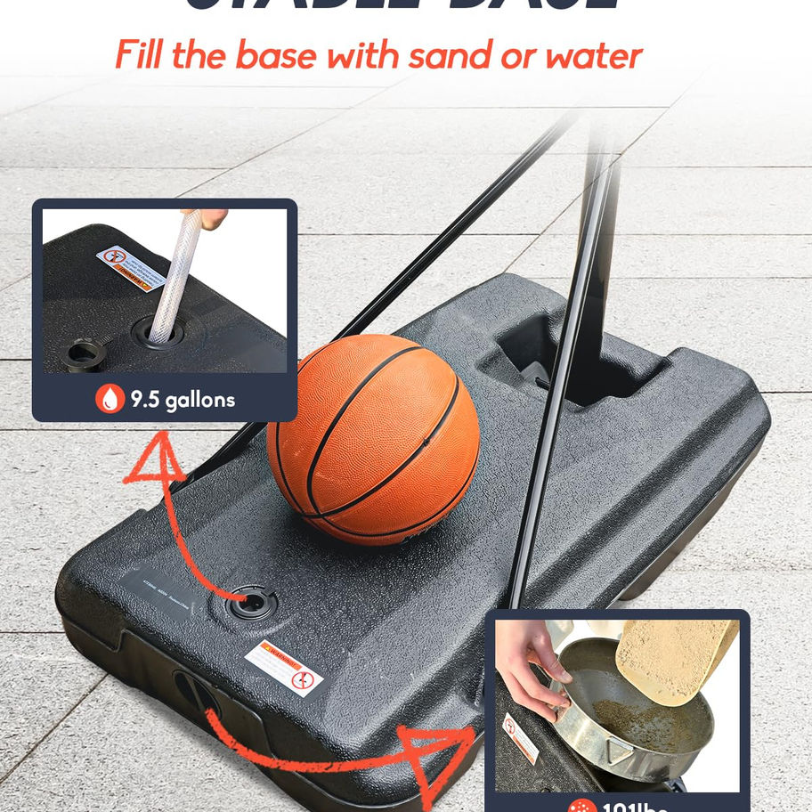 ADJUSTABLE HEIGHT RANGE: Mayfire offers an adjustable height range from 4.9ft to 8.5ft with 10 levels of height adjustment. It reaches 4.9ft - 6.1ft with two poles installed and 7.3ft - 8.5ft with three poles installed, perfectly suitable for kids of different growth stages and players ENHANCED STABILITY & DURABILITY: The base of our basketball goal can be filled with 9.5 gallons of water or 101lbs of sand offer sufficient support for the increased maximum height. The shatterproof PC backboard not only ensures better durability but also provides a better shooting experience FUN & SAFE FOR KIDS: Our outdoor basketball hoop is designed specifically for children and teenagers, making it an excellent choice for after-school entertainment. It encourages them to stay away from electronic devices and participate in outdoor activities more, which is a fun and safe choice for young users INDOOR & OUTDOOR USAGE: Equipped with built-in wheels at the front of the base, this portable basketball hoop can be easily moved to any location, including driveways, backyards, front yards, parks, playgrounds, garages, gyms, and even indoors. PERFECT GIFT & SERVICE: Mayfire basketball hoop, it's an excellent gift for kids to enjoy their leisure time and play with friends outdoors. If you receive damaged goods, missing parts, or encounter delivery issues, don't worry. We offer 24-hour online customer service, ready to assist you with any questions or issues at any time