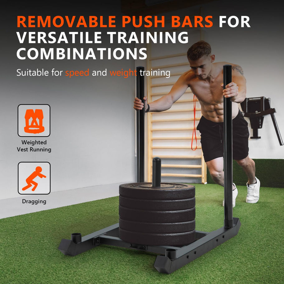 Heavy-Duty Construction: Crafted with thickened steel for durability, this sled weight rack can withstand intense training sessions and heavy loads.Heavy duty nylon harness and Reinforced steel D rings included. Compatible with 2-Inch Plates: Specially designed to fit 2-inch Olympic weight plates, making it versatile for professional and home gym use. Smooth Glide Surface: Built-in skid-resistant base ensures smooth operation on various surfaces while protecting your flooring Multi-Functional Use: Perfect for pushing, pulling, and dragging exercises to build strength, stamina, and overall athletic performance. Innovative Push-Pull Design: Unlike traditional sleds, our push bar can be quickly swapped between left and right sides with a simple insert-and-pull mechanism. This makes changing directions during training or tight turns effortless, ensuring a seamless workout experience without wasting time on adjustments.