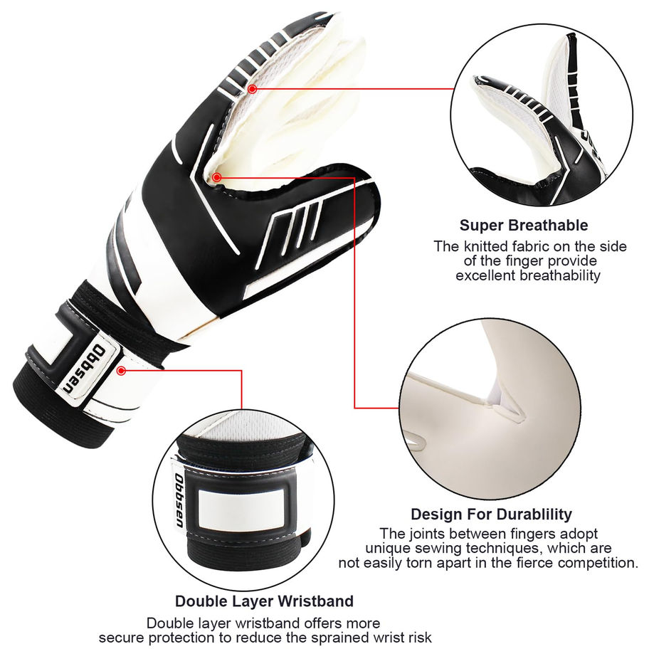 ⚽【STRONG FINGER SPINE PROTECTION】The newly inbuilt fingersave protection helps prevent finger spine from injuries when you training, as well as ensures you have max stretches and are more flexible when catching the balls. ⚽【GRIP MATTERS EVERYTHING TO A GOALKEEPER】: Superb grip matters everything to a goalkeeper. 4MM+4MM thickened palm cushions (natural latex and sponge) guarantee Obbsen goalkeeper gloves' superb grip, making it easier to block all shots. Quality materials ensure a sticky and grippy grip. ⚽【COMFORTABLE AND BREATHABLE】: EVA and natural latex ensure it is softer and more comfortable. A unique embossing design and flat cutting improve the quality. The air mesh on the side of the finger also keeps it breathable. ⚽【DOUBLE WRIST DESIGN & SAFETY】:360°wrap-around twice velcro strap to get you more wrist supports. We apply environmentally friendly materials for the soccer gloves to avoid health issues for you or your children. ⚽【AFTER-SALE SERVICE ON 24-HOUR EMAIL】: The goalkeeper gloves are suitable for kids, youth, and adults in training or competitions. Customers’ concerns are our priority. If you have any questions about the item or service, contact us via email, and we will resolve them as soon as possible.