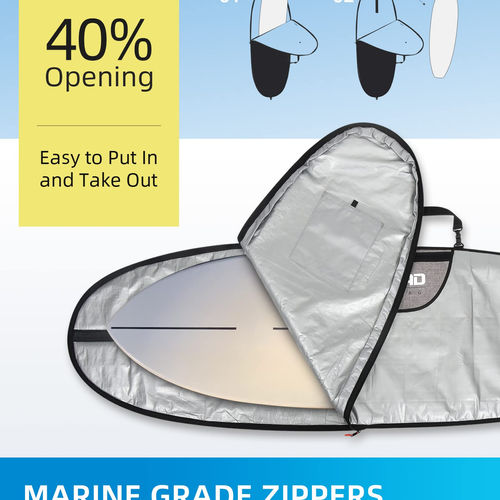 SIZE AND SHAPE: 7’6’’ x 24’’, for board size up to 7’7’’ x 25’’; round head and round tail; with fin slot opening; please refer to the first product picture. PROTECTION: With durable heavy-duty reflective shells and 5mm (0.2 inches) padding each side in between, plus extra 8mm (0.31 inches) at reinforced head and tail sections each side, this surfboard bag will protect your board from most dings and fractures occur out of water, especially when you travel around with it. ZIPPERS: #10 nickel plated big teeth zippers; about 40% zips opening at tail section, easy to put in and take out.All zippers are placed with a 4cm (1.5 inches) wide padded flap, so your board rails won’t sit and rub against the zippers. There are 2 sliders on all bag zips placement so you can padlock them when travelling. DURABLE AND THOUGHTFUL: Wtih all the top-grade materials, craftmanship of reinforced and box stitching also adds up the durability of this bag. Inner patches for stitching at stress areas double guarantee the strength of the handle and strap. It's designed with 1 velcro inner pocket 28x25 cm (11’’x10’’), and 1 exterior zipped pocket 68x50 cm (27’’x20’’). You have plenty of room to put away the gears. COMFORTABLE: This bag is with padded carry handle and adjustable shoulder strap. The extra thick big pad, 33x10.8x1.5 cm (13’’x4.25’’x0.6’’), will greatly relieve the pressure on your shoulder. You can also detach the shoulder strap during car roof transportation, or if you want to carry it by hand.