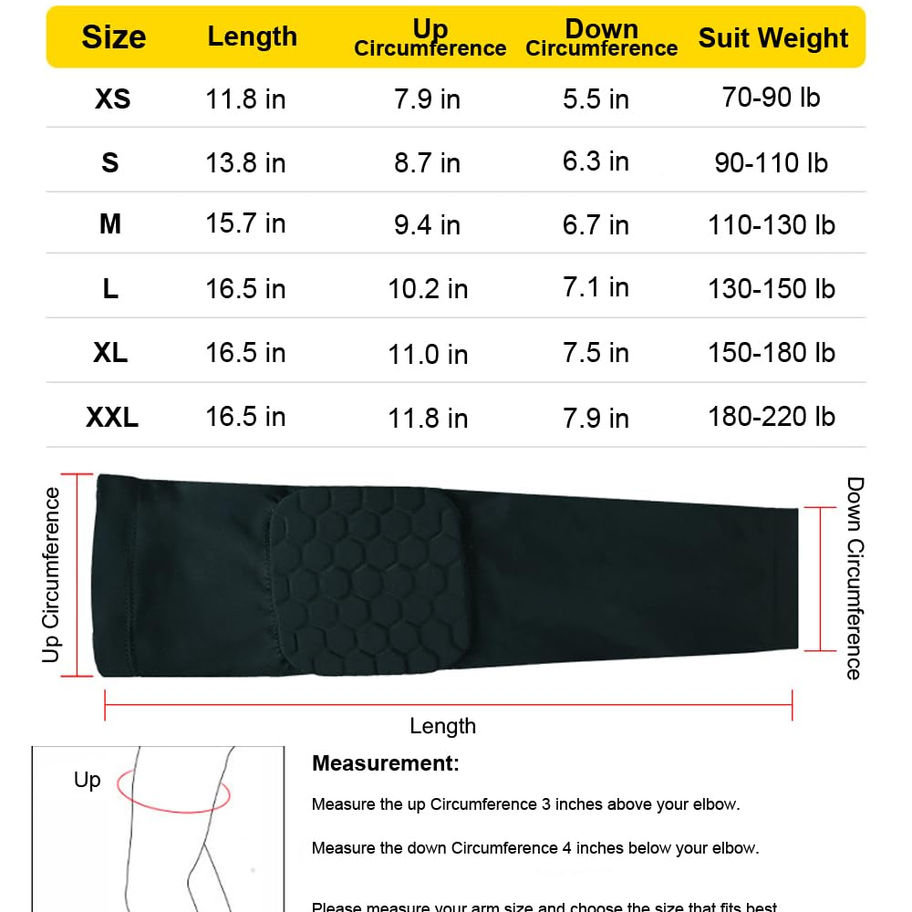 Protection Upgrade - Our padded arm sleeves apply 10mm thickened EVA honeycomb cushions to protect the elbow area when you sport impact damage or joint damage recovery. Honeycomb arm sleeve also help maintain the temperature of the arm muscles and increase blood flow and circulation. Safe and soft for your skin, provide advanced protection against scratches and elbow hits. High-Quality Elastic Fabric - The blended fabric of nylon and spandex is soft, smooth and elastic, which can perfectly fit the arm. Provide optimal compression to help ensure blood flow and proper circulation during exercise. The breathable elastic is going to keep you cool, will fit tightly, and help to wick away sweat during strenuous exercise. Anti-slip Strip - The arm compression sleeves have silicone anti-skid strip in the up area. This design can effiectively prvent knee down in the movement , relieve stress in motion and it is useful to coordinate muscle capacity and to protect the skin. Our arm & elbow pads have good breathability can quickly wick away sweat, which can make your arms and elbows better protected. Suitable Sports - Most usd as Basketball arm sleeves, volleyball arm sleeves, football arm sleeves. Support for other activities requiring strenuous arm movement, Handball, Soccer, Tennis, Baseball, Crossfit, Weightlifting, Powerlifting, etc. More confidently enjoy these activities and keep your peak performance anytime. Choose Your Size - Our volleyball sleeves have 6 sizes for most adult and child sleeves. Please measure your elbow and choose your padded elbow sleeves, then your will find it a perfect fit. Available in sizes for youth boys and girls, and adult men and women. Please don’t hesitate to contact us if you have any question or concerns before or after your purchase, we are committed to your 100% satisfaction.