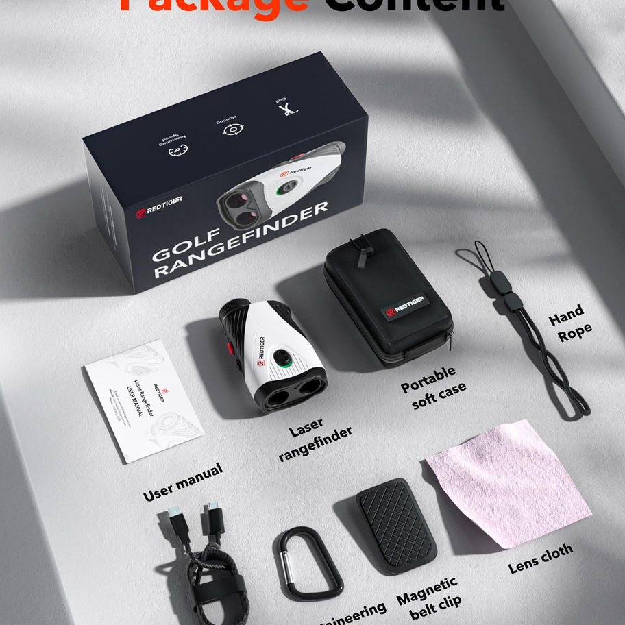 [Golf Rangefinder All Leveled Up] Redtiger range finder golfing is now available: This distance yardage rangefinder's features include slope switching, a magnetic mount, a 1200 yards maximum measurement range, and USB-C charging. It is not only appropriate for golf but also for hunting and bowhunting. [High Accuracy Measurement] This golf rangefinder has a range of 5-1200 yards with an accuracy of 0.5 yards (yards/meters). It also has a transflective LCD display and a 7x magnification, which ensure clear and quick reading. The slope switch makes it legal for competition golf play while slope correction ensures even more precise distance. [6 Measurement Modes] Golf laser rangefinder with a brief press of the button, you can change between measuring modes on a golf laser rangefinder. You can choose from six different modes:slope compensation, golf flag locking, horizontal and height ranging, speed measuring,and continuous scan measurement. [Reliable and Portable with Magnetic Stripe] This portable golf range finder is simply attached to metal objects, such as your clubs or cart, thanks to an included magnetic strip. Additionally, a magnetic belt clip is included so you can attach it to your belt or golf bag and carry it around with you. The water-resistant grade of the golf rangefinder is IP54. [Rechargeable Support and Aftersales Service] Golf rangefinder supports USB-C charging,output 5V/2A,30000 times available.You can make most of it for your golf training or playing.Redtiger always provide 2-year assurance and lifetime technical support for its golf range finders. If you have any problem with this range finder, please reach out to our after-sale team.
