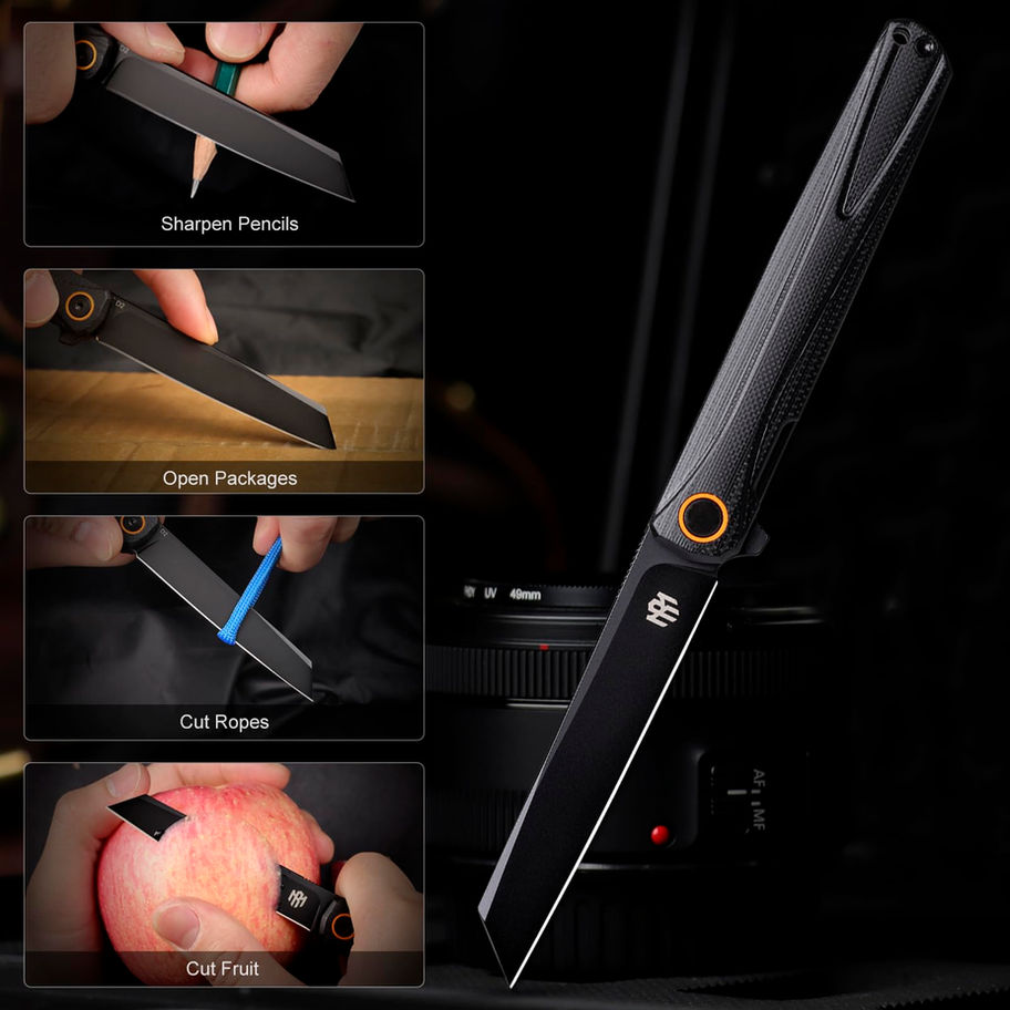 PREMIUM DESIGN: Sleek black EDC folding knife with textured G10 handle scales and orange accent ring for enhanced grip and style BLADE CONSTRUCTION: High-performance black-coated steel blade with tanto-style tip for superior cutting capability and durability SECURE MECHANISM: Reliable liner lock system with smooth one-handed operation for quick deployment and safe closure PORTABLE CARRY: Integrated pocket clip allows convenient everyday carry and quick access when needed COMPACT SIZE: Folding design offers both portability and functionality while maintaining a stylish appearance