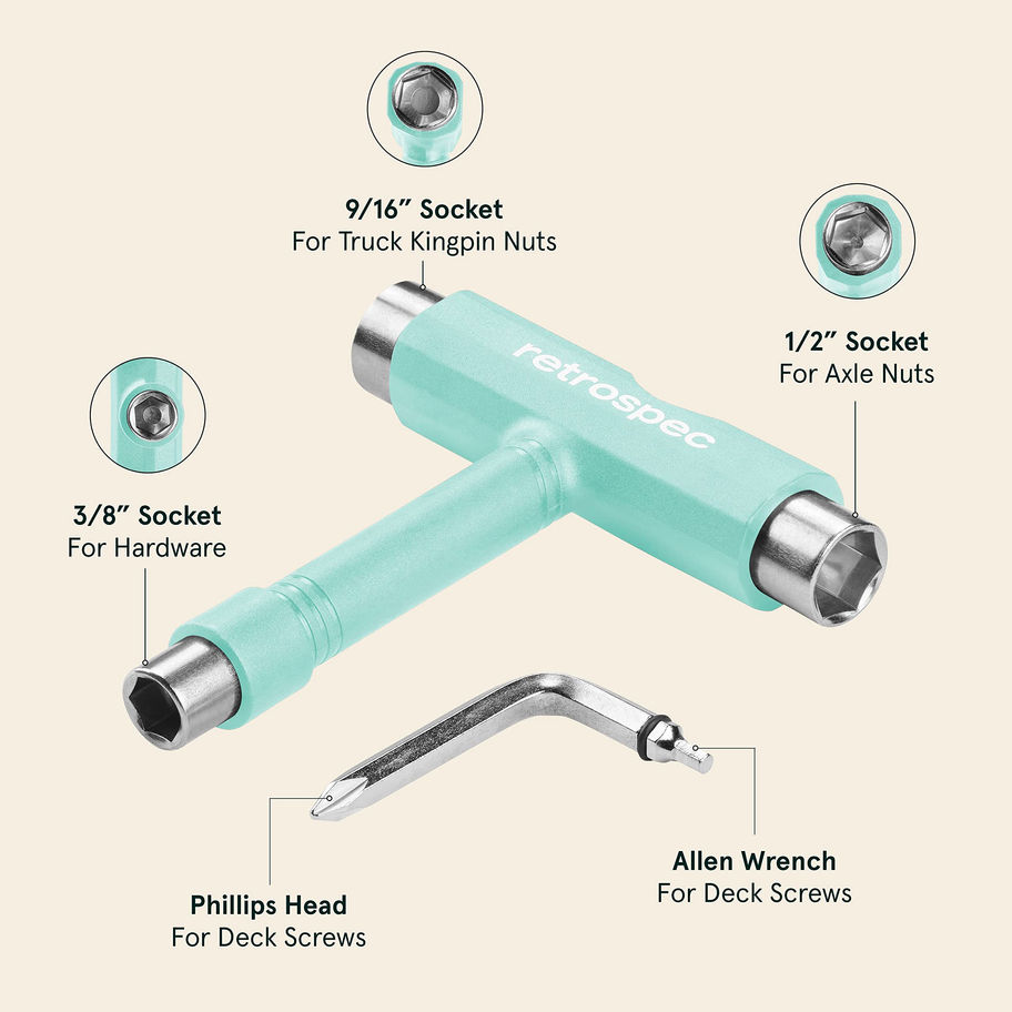 Product 1: ZED LONGBOARD: Our freshest longboard nods to the 1950’s makeshift backyard longboards with its classic surfboard shape and feel. ZED not only carries us here and there, but transports us back to a time of sun, surf, salty air, breezy days, dewy nights, and reverb-doused hits of yesteryear. Product 1: ANTI-BITE TECHNOLOGY: Avoid wheel bite at all costs. In fact, put it in the back of your mind. We put ease-of-ride #1 by including wheel wells to eliminate grab. Durable 70x51mm 85A PU wheels with rock finish. Product 1: HIGH-SPEED & ACCURATE: Precision ball bearings in the ABEC-7 tolerance grade is ideal for high speed and extreme running accuracy, capable of handling all of your adventures. Product 1: SLICK & GRIP: Enhance your ride with smooth and shock absorbent 70 mm Polyurethane wheels, plus a rock finish for superior grip. Product 2: ALL-IN-ONE Adjusts & tightens wheels, trucks, & kingpins with ⅜”, ½”, 9/16” Sockets. Also includes 7/32” & ⅛” Allen Wrenches, Phillips Head Screwdriver & Bearing Press/Remover