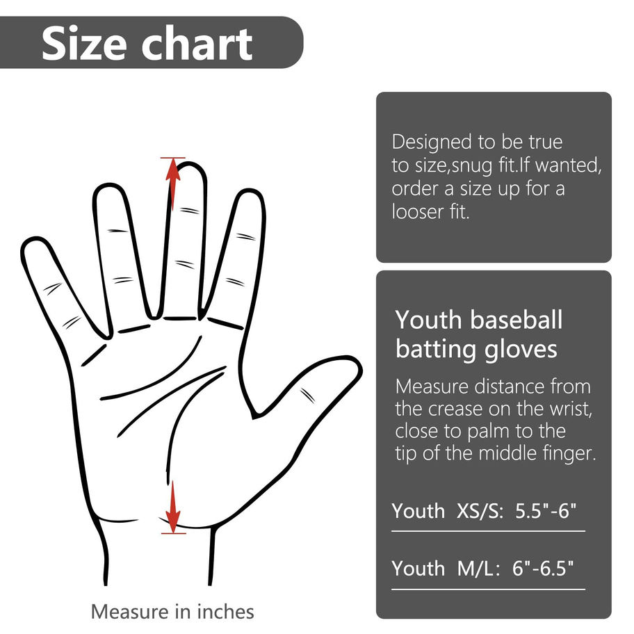 Designed to integrate ergonomics and style—Our designers, who have many years of experience and are very familiar with the details of the structure of young people’s hands, have successfully integrated form and function in this product. The RSPGO youth baseball and softball batting gloves are both stylish and ergonomically effective. Premium Professional Quality—These gloves are constructed from top-level synthetic leather and soft spandex. The durable palms are resistant to tearing and provide a superior grip while the spandex backs of the gloves are flexible and breathable. That’s sure to deliver good results. Perfect Fit Size—Use the size chart to pick the correct size for your young athlete [Youth XS/S (5.5 in-6 in) Youth M/L (6 in-6.5 in)]. The design of these youth gloves is based on the measurements of many young people’s hands to make sure the gloves have a snug, comfortable fit while still maintaining their flexibility. Best Gift for Kids—With its unique child-friendly design, superior quality, and elegant packaging, this is a great gift for kids during the holiday season (or any other time of the year). WRIST TECHNOLOGY-With flexible and retractable material to achieve adjustable on the wrist.