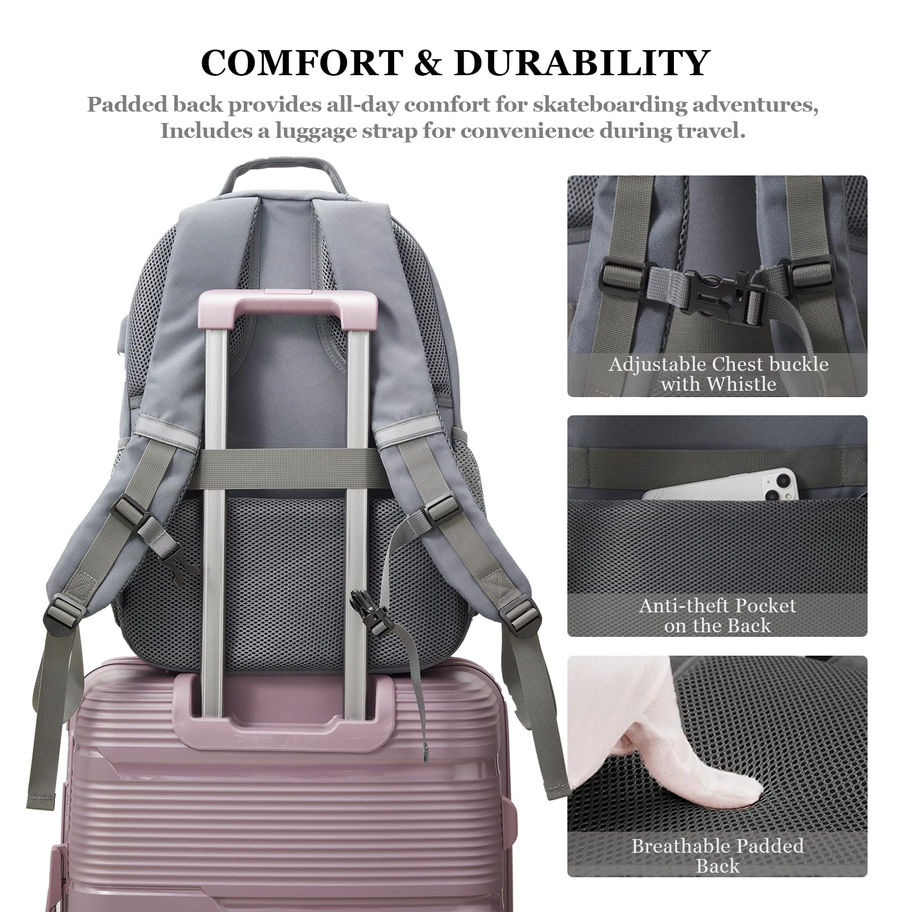 Spacious & Organized: Featuring a separate laptop compartment for 15-17" laptops and multiple front pockets, this skateboard backpack offers easy access and organization. The main compartment has a large mesh zippered pocket for all your skateboard accessories and travel essentials. Hidden Safety Features: Equipped with a hidden zippered pocket on the back for valuables and reflective tape on straps for nighttime safety. The whistle snap clip is perfect for emergencies, making this skateboard bag ideal for skateboarding adventures. Comfort & Durability: Crafted from durable water-resistant Nylon fabric, this skateboarding backpack is reinforced at stress points. Mesh airflow shoulder straps and an ergonomic design relieve shoulder and back pressure, providing all-day comfort for longboard enthusiasts. Includes a luggage strap for convenience during travel. USB Port Convenience: Stay connected on the go with an external USB Charging port and internal cable, making it easy to charge your devices (power bank and external cable not included). This feature makes the skateboard travel bag perfect for college and travel. Versatile & Practical: Use this professional skate backpack for hiking, camping, gym, yoga, commuting, or as a travel backpack. Ideal gifts for skateboarders, it’s perfect for birthdays, graduations, holidays, and more. A versatile skater backpack for men and women!