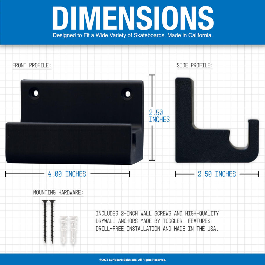 Great for your grarage, living room, or any other space where you need to store your skateboard Easy to use - simply place your skateboard on the rack and it's ready for storage This rack is designed to fit all types of skateboards Hardware included for easy installation on any wall Minimal design puts the focus on your deck, giving your room a clean aesthetic