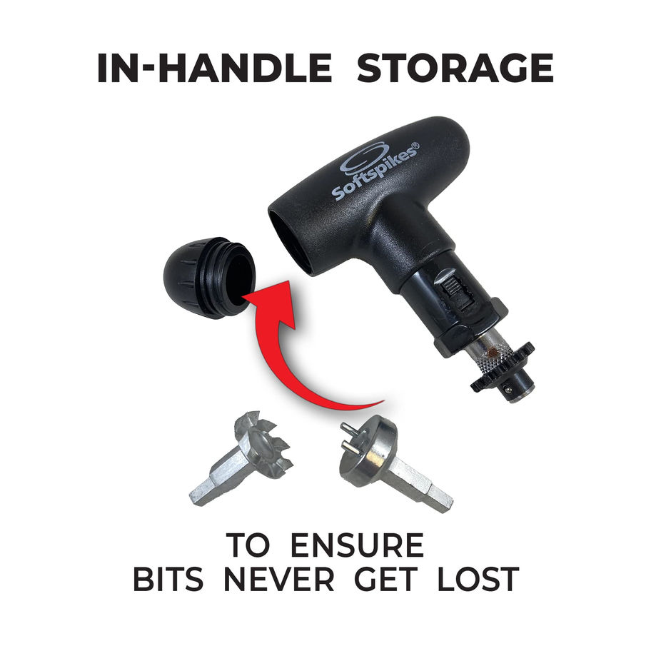 T-handle ratchet fits comfortably in your hand Includes ripper bit, standard bit and ratcheting wrench Power bits to remove and install both metal spikes and plastic cleats