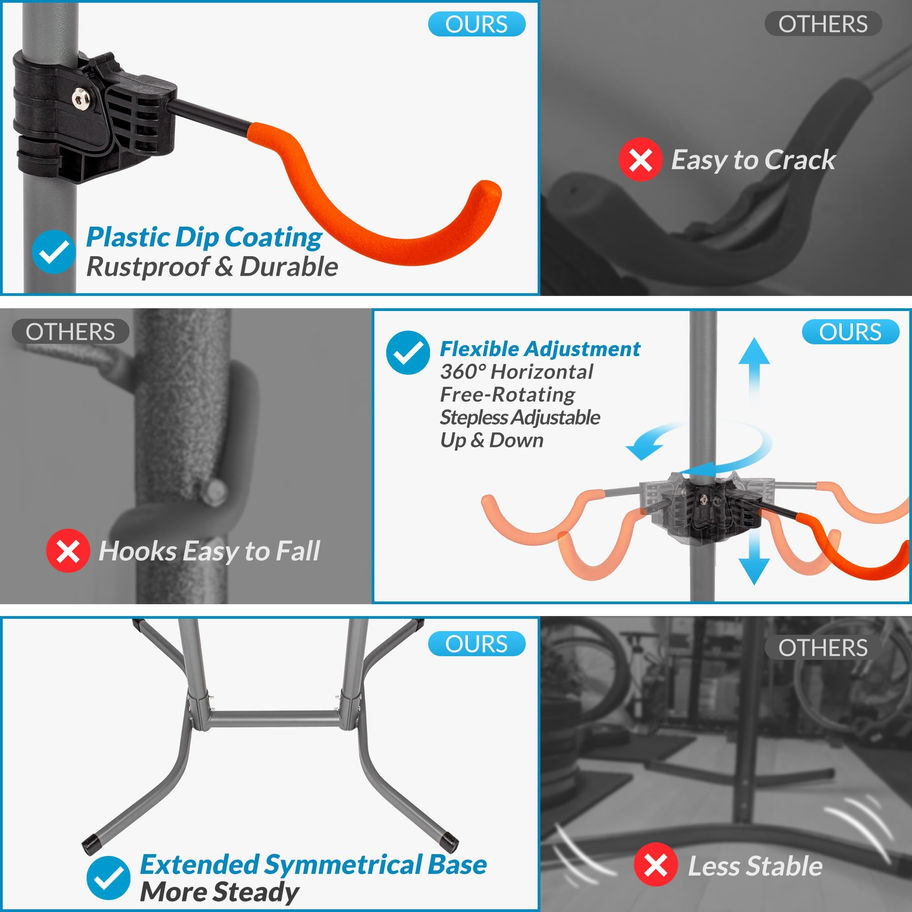 Extended Base for More Stability: Our bike rack features an extended base with a symmetrical design that enhances stability. Additionally, the base is equipped with anti-slip rubber feet to prevent slipping and tipping. The bike rack is made of high quality steel which makes it durable and sturdy. The freestanding design makes the rack suitable for various occasions, not just at home/ apartment or in the garage, but also outdoors, meeting more of your needs. Space-Saving Design: The bike holder comfortably accommodates 4 bicycles and can meet the storage needs of the family. With a safe load capacity of up to 200 pounds (supporting up to 50 pounds per bike), this bike stand is also ideal for heavy bikes. The design of vertical storage saves a significant amount of floor space, keeping your home or garage tidy while offering more convenience and space. The rack's stylish gray, black, and orange color scheme fits various interior design styles. Adjustable Support Arms: The rack features a unique hook design with flexible adjustments, allowing for 360°horizontal rotation and stepless vertical adjustments. This versatility makes it compatible with any type and size of bicycles, including road, mountain, hybrid, E-bike and children's bikes. The arms are equipped with anti-slip pad to ensure they remain securely in place once adjusted. The hooks are plastic dip coated to prevent scratching the bike's paint and are more durable than rubber. Easy to Install and Use: After the simple installation, just place the bike stand to where you need, then adjust the support arms to suitable position and balance the bicycles on the arms to use. Rubber anti-slip pad on the bottom feet prevent tipping, enhancing safety. Moreover, this bike storage rack comes with pre-drilled holes and screws, making installation effortless. With the help of the instruction manual, you can easily assemble it and enjoy the process. Dimension & Guarantee: The dimension of the bike hanger is 24.6"D x 28.6"W x 81"H. If you have any questions or concerns about our bike storage rack, please do not hesitate to get in touch. We are always here to provide professional solution for you. If you are not completely satisfied with our bike hanger, please contact us and we strive to ensure that every customer has a positive shopping experience. Thanks for choosing Suchtale.