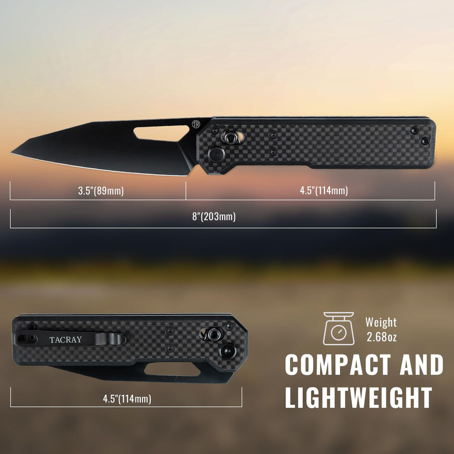 Premium Blade: The TACRAY Tarcus folding knife features a 3.5" D2 steel blade with a black DLC coating, providing exceptional edge retention, durability, and corrosion resistance. This high-performance blade is perfect for various cutting tasks, making it an ideal companion for outdoor adventures, work, and everyday use. Smooth & Secure Crossbar Lock: Designed for safety and convenience, the reliable crossbar lock keeps the blade firmly in place, preventing accidental closure. Paired with a thumb hole for effortless, one-handed deployment, this mechanism ensures quick access and steady control during every use. Ultra-Lightweight Design: Weighing just 76g, the Tarcus knife offers a featherlight feel without compromising strength. The carbon fiber and G10 handle provides exceptional durability, reducing hand fatigue and making it comfortable for prolonged use during hikes or daily tasks. Perfect EDC for Any Adventure: Whether you're hiking, camping, or handling tasks around the house, the Tarcus knife is your go-to tool. Its compact size and lightweight build make it easy to carry in your pocket, backpack, or gear bag, ready to tackle any situation indoors or outdoors. Dedicated Customer Support: At TACRAY, we prioritize your satisfaction. Our knives come with responsive customer support and a commitment to product quality. If you have any questions or concerns, our team is ready to assist, ensuring you get the best experience with your Tarcus folding knife.
