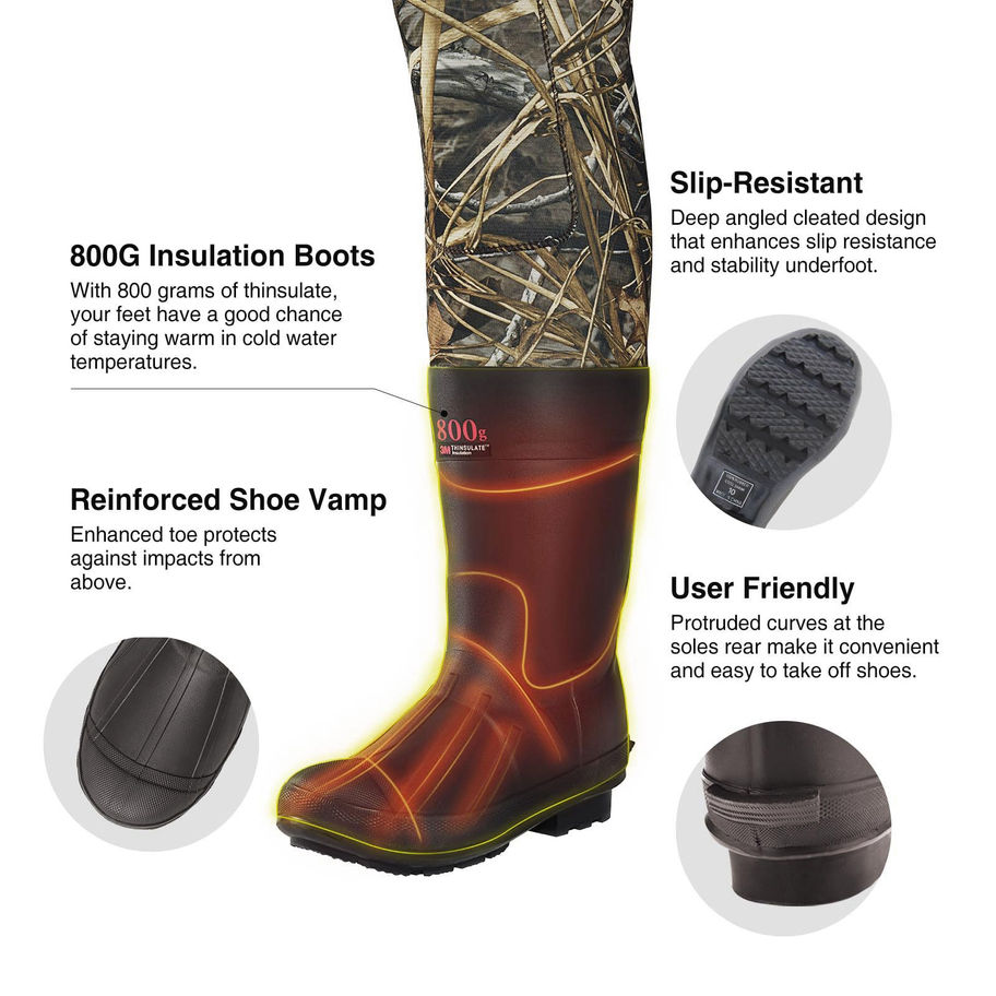 【ATTENTION】PLEASE MIND THE SIZE CHART AND CHOOSE THE RIGHT SIZE BEFORE BUYING! 【Sturdy & Wear-resistant】3.5 mm neoprene upper with tough poly / jersey shell and stretch liner and triple-finished seams that are stitched, glued and taped, makes it extra solid, you will always have peace of mind that your waders will perform while out in the waters and woods hunting and fishing. 【100% Waterproof】Besides premium quality material guarantee, the TideWe waders also feature with armor weld double-stitched and sealed seams, polyurethane-coated leggings, all these give extra protection and make sure there is no leak. 【Solid & Insulated rubber Boot】Built-in rubber boot is comfortable and can be worn with or without socks; 800 Gram 3M Thinsulate ultra insulation makes your feet warm; Reinforced shoe vamp for added puncture protection; Our rugged boot tread pattern provides you with better balance and traction on wet and muddy surfaces; better grip means fewer slips and falls. 【Adjustable & User-Friendly】Adjustable neoprene suspenders with and loop attachments allow you to pull the waders on and off super easily due to the simple design. Quick-drain chest hand-warmer pocket with small pocket inside to keep things dry.