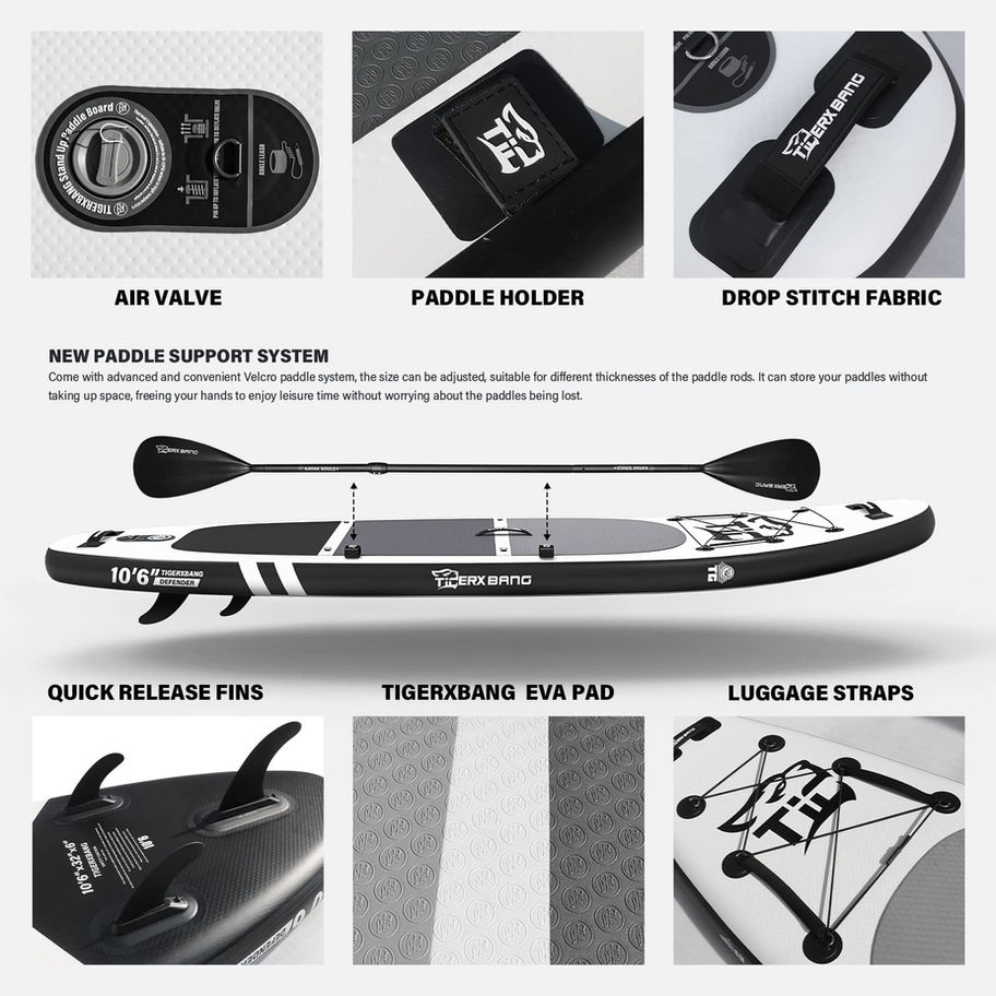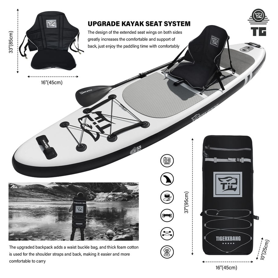【Military Grade Materials】The TIGERXBANG inflatable paddle boards are made of ultra-light military-grade PVC material which has excellent wear resistance, toughness, and long service life. The 10'6" x 32" x 6" dimensions provide greater buoyancy and sufficient area to support standing or sitting, and won't deform easily in the water even under heavy load. 【Paddle Support System】Tigerxbang Paddleboards Come with advanced and convenient Velcro paddle system, the size can be adjusted, suitable for different thicknesses of the paddle rods. It can store your paddles without taking up space, freeing your hands to enjoy leisure time without worrying about the paddles being lost. 【Quick-Release Fin System】Inflatble Paddleboards come with upgraded quick-release fin system, which more save your time and strength before paddling, solve the sand stuck problem effectively, the paddleboards fins made in high-class material, which more stronger and more stable structure, avoid lost in using. 【Upgraded Kayak Seat and Backpack】SUP kayak seat with a new design of the extended seat wings on both sides greatly increases the comfortable and support of back, which you can enjoy the paddling time with comfortably. A zippered bag is added on the side, which is convenient for storing personal items and is not easy to lose. The upgraded backpack adds a waist buckle bag, and thick foam cotton is used for the shoulder straps and back, making it easier and more comfortable to carry. 【Various Usage Scenarios】All around Paddleboards version is suitable for beginners and intermediate paddlers. With a weight capacity of up to 350 lbs, the SUP paddle board can accommodate three young adults of medium weight standing on board at the same time. It is very suitable for all skilled paddlers to cruise, explore, or sit back and enjoy the scenery of nature. Our inflatable stand up paddle board provides more stable paddling and better tracking, ideal for all SUP paddlers.