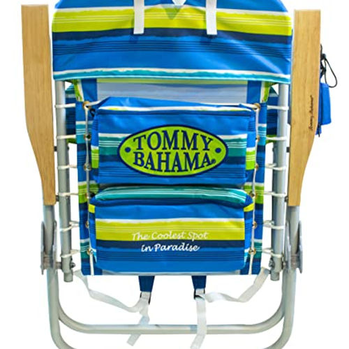 EXTRA TALL BEACH CHAIR: Tommy Bahama extended seat height backpack chair with 4 recline positions offers hands-free portability and is lightweight to carry at only 9 lbs. with the adjustable backpack straps ALL-DAY COMFORT: Flexible suspension design supports and conforms to your body, while the SAFE-ADJUST technology that's built into the wooden armrests prevents your fingers or hands from being pinched PREMIUM BEACH ACCESSORY: Includes seat-side zippered pouch, cell phone pocket and cup holder DURABLE CHAIR: The rust-proof aluminum frame is all weatherproof with a seat height of 17" off the ground BEACH CHAIR DIMENSIONS: Measures 24.25" x 25.75" x 38" when open and 31.5" x 23" x 4.5" when closed, and supports up to 250 lbs.and supports up to 250 lbs.