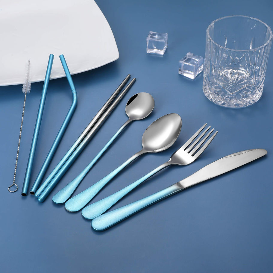 HEALTH AND ENVIRONMENTAL PROTECTION: This travel lunch utensils set is made of by high quality high quality food grade stainless steel ,reusable and durable for daily use. Easy to clean, the dishwasher safe. 8 PIECES PORTABLE UTENSIL SET WITH CASE INCLUDE: dinner knife, dinner spoon,dinner fork, chopsticks ,clearning brush ,straight straw, bent straw ,teaspoon,carry organizer bag EASY TO CARRY: This reusable cutlery set is small in size and light in weight ,The 8-piece portable utensils is a must-have for daily use. Suitable for taveling ,working ,school, flight, workplace, eating on the go ,picnic ,camping,etc. CLASSIC DESGIN: This portable cutlery set a simple appearance, smooth edges without rough spots, anti-oxidation, stylish and generous. This travel utensils with case be paired with any style of kitchen to meet the basic dining requirements of everyone. 100% SATISFACTION GUARANTEE: We provide lifetime warranty and a 60-days refund or replacement for no reason.Your satisfaction is our highest priority