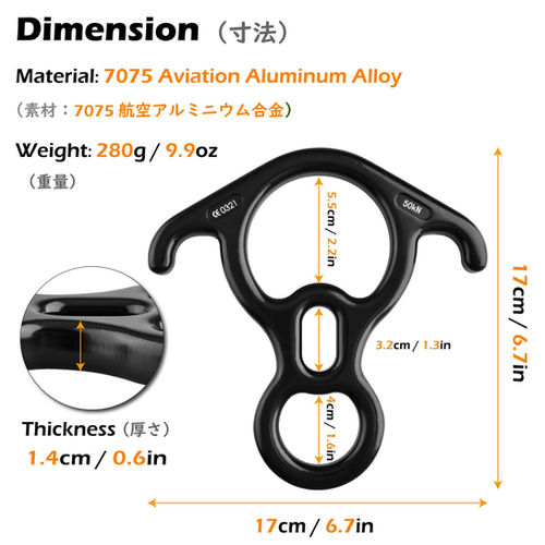 ✅【MATERIAL】7075 Aviation aluminum alloy, the rescue figure 8 descender is excellent in high strength, smooth surface for durable use ✅【SPECIFICATIONS】Size: 17x17 cm; Weight: 0.2kg; Maximum Breaking Strength:11023 lbs (50KN/5000kg) ✅【CORRESPONDING ROPE】8-13 mm. Surface anodization to maximize reducing rubbing between the rope and the figure 8 belay device, preventing damage to rope and protect fingers from burns ✅【APPLICATIONS】Suitable for rappelling, exploring, technical rope rescue, engineering protection, sport rappeller, etc ✅NOTE: THIS ITEM IS NOT INTENDED FOR USE AS A MOUNTAINEERING CARABINER!