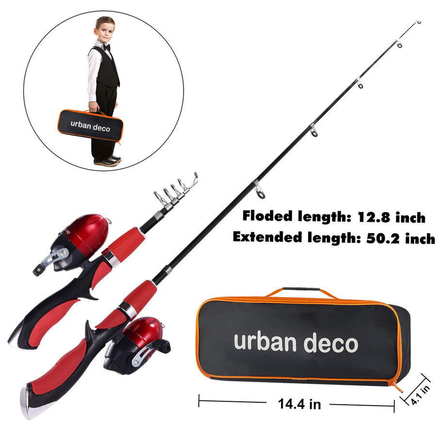 TELESCOPIC FISHING RODS: A 50.2-inch long kids fishing pole is included in the well-known Urban Deco rod and reel combo. This telescoping fishing rods includes: fishing rod, a spinning reel and string with fishing line, a stocked fishing tackle box, fish control device, fishing line cutter, and a travel fishing bag EPOXY CONSTRUCTION FISHING KIT: Urban Deco fishing rod & reel combos have a robust epoxy construction design combined with soft EVA and plastic, making toddlers fishing pole durable and not easily broken. The fishing poles for men features an EVA grip that is ideal for little hands and is extremely simple to hold PORTABLE FISHING EQUIPMENT: The Urban Deco Portable fishing rod & reel combos has a collapsible design that makes fishing pole kids small enough to carry with you. Our deep-sea fishing rods are made of lightweight materials. Take your fishing accessories and go fishing with your family EASY TO CAST Kids FISHING REEL: The spinning reel is pre-spooled and has a cast button. No worry about tangles. Simply cast after releasing the fishing line by clicking the button. Make your fishing more convenient with collapsible fishing rod and provide you more chances to catch fish PERFECT FISHING KITS FOR ADULTS: The Urban Deco fishing poles for men has everything a beginner needs to get started with fishing. Pocket fishing pole for kids ages 10-12 is also intended to be simple and straightforward to use for children who are just starting out or who have prior fishing expertise. Fishing with children is a fun way to spend time outside