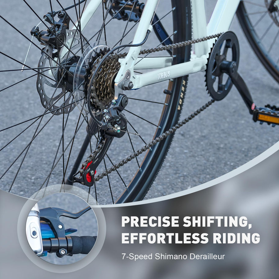HYBRID BIKE: Experience the ultimate comfort and style with Viribus's hybrid bike, featuring a cushioned seat and IPX4 front & rear lights for smooth commutes, leisure rides, outdoor fitness, and touring adventures SMOOTH SHIFTING: Our men's bike boasts a 7-speed derailleur that provides smooth and accurate gear changes with easy thumb shifters, ensuring seamless and stable riding experiences at all times SAFE BRAKING: Equipped with dual disc brakes for outstanding performance at high speeds, our aluminum alloy brake pads are built to last, providing reliable braking for your rides in any weather DURABLE CONSTRUCTION: Enjoy your rides with our lightweight yet durable city bike, featuring corrosion resistant aluminum alloy frames that haul up to 330 pounds, making every trip safe & fun EASY ASSEMBLY: Assemble your Viribus's adult bike with ease, as it arrives with over 85% of the assembly complete, allowing for a quick and effortless setup process