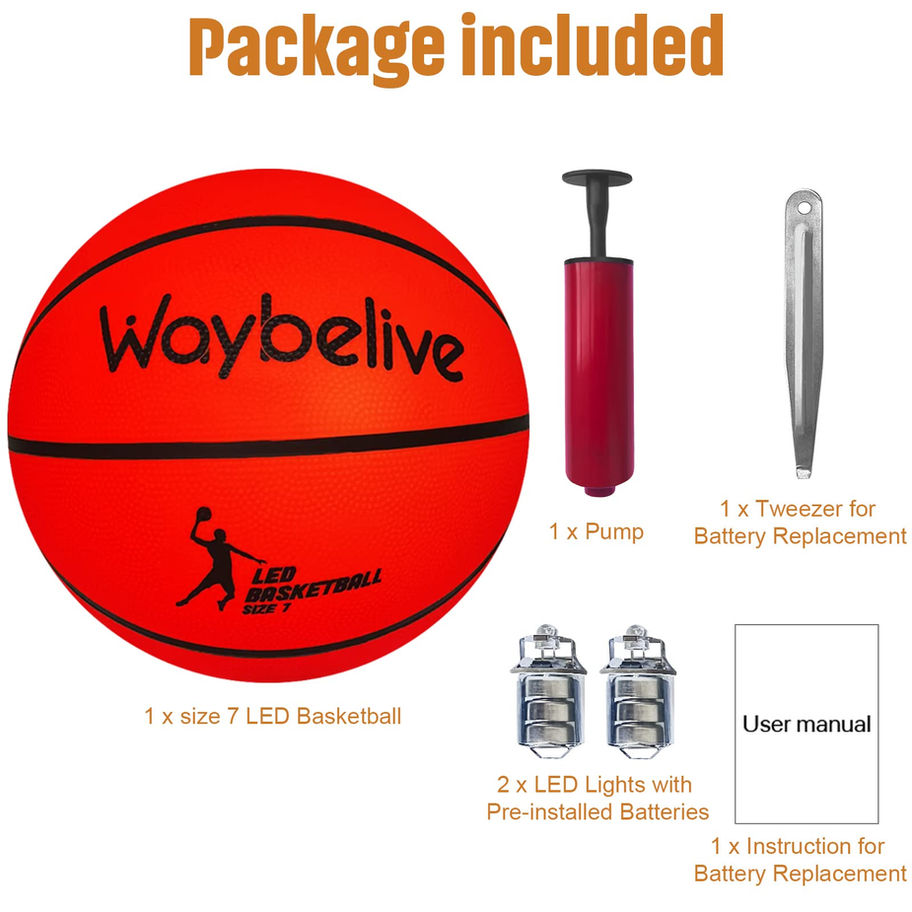 【LIGHT UP BASKETBALL AT NIGHT】Our LED basketball can light up the basketball court at night outdoors, help to accurately record the score, and increase the children's interest in playing basketball, enjoy the fun of playing basketball at night! 【DURABLE AND WATERPROOF】The LED basketball is made of a high-quality and waterproof rubber exterior to help keep the glowing lights secured in their compartments, which is strong enough for long-term use, don’t worry about breakages or rain. 【Long-lasting brightness】Each LED basketball comes with two pre-installed batteries. You will also receive a tweezer and instructions that are used to change the batteries. The batteries last about 30 hours, which will give you plenty of time to play through the night. 【Easy to use】: Just simply use the pump to inflate the basketball, and the basketball will start swishing in the shots. The basketball bounces sensitively, which is perfect for adults, teens, and kids! 【GOOD GIFT FOR KIDS】Designed for basketball fans who play at night. Our LED basketball is the official size 7, and it's the most common and most used size for basketballs. Package included: 1x Light up basketball with LED lights, 1x pump, 1x tweezer, 1x user instruction&1x plastic bag.