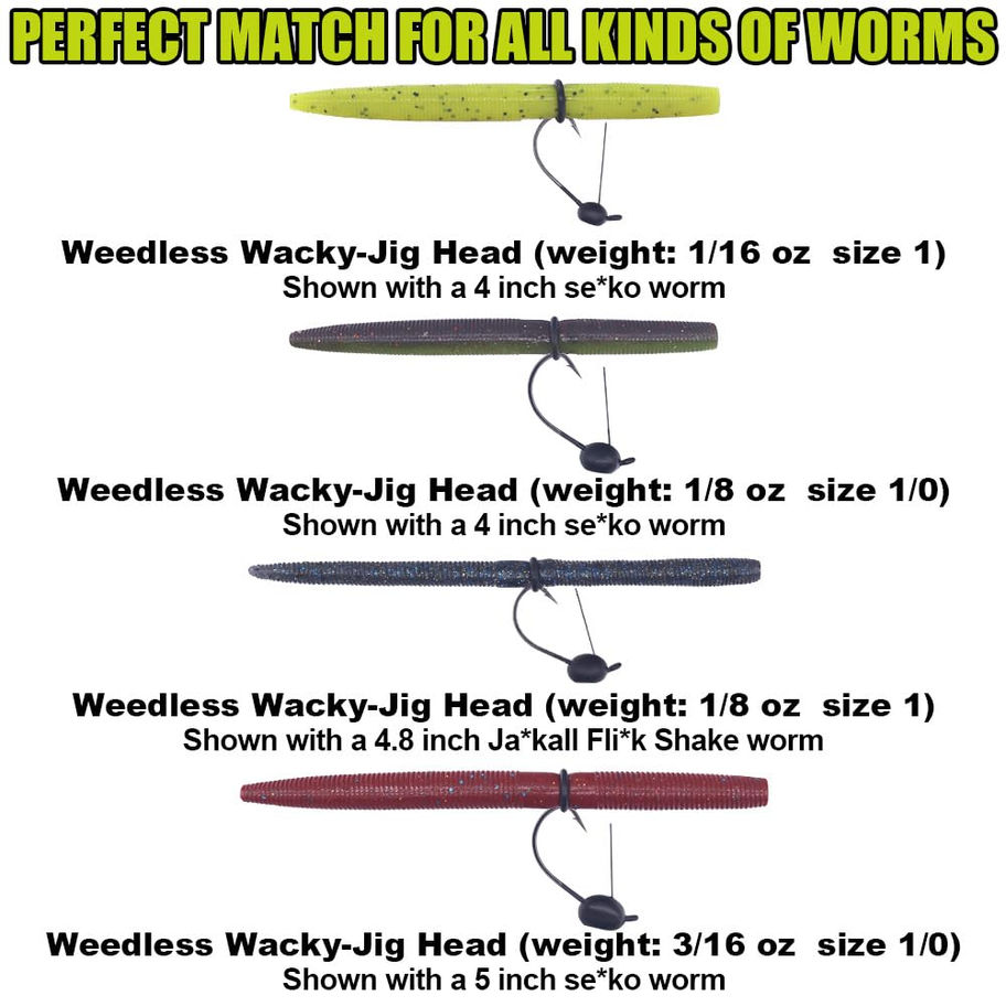 Advanced Weedless Design: Navigate through the thickest vegetation without a hitch. Our weedless design ensures a snag-free experience, allowing you to cast with confidence in any conditions. Unique Stand-Up Capability: Engineered to keep your bait upright on the bottom, our jig heads increase visibility and provoke more strikes by presenting your bait in the most natural and enticing way possible. Optimized for Wacky Rigging: The perfect hook bend and size are specifically designed to complement your wacky rig, ensuring a natural, irresistible sway that bass can't ignore. Versatile Size Options: Available in 1/16 oz (1.8g), 1/8 oz (3.5g), and 3/16 oz (5.25g) sizes, our jig heads cover the mainstream needs of wacky rigging, ensuring you have the perfect weight for any situation. Quantity for Quality: Each pack contains 10 high-quality jig heads, providing you with ample supply for your fishing adventures.