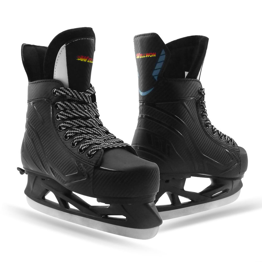 ADJUSTABLE ICE SKATES: The ice skates have 3 sizes with gear adjustment, fitting true to your feet size. With enough wiggle space around the toes but snug in the heel and midfoot to provide max. support. Each skates padded footbed cradles your foot, giving you the most out of every run STAINLESS STEEL BLADE: Made of stainless steel for holding their edge longer, prevent rusting and deliver consistent performance with minimal maintenance. Not easy to bend, help you to slide smoothly and steadily on the ice. The blade is already sharpened and has protective cover 360° COMFORT AND WARMTH: Hockey ice skates adopted cold-resistant PVC, composite EVA mesh fabric, added thick woven lining and deluxe comfort padding to provide you with warm and comfortable skating experience in cold weather SAFETY PROTECTION: The outer hard shell completely wraps around foot and ankle, resistant to impact and can slow down the impact force during skating without damaging the feet and joints. And the fastening shoelace provide 2nd layer protection. Suitable for all types of skaters BUY WITH CONFIDENCE: WELLWON's goal is to provide the best shopping experience to customers. Please feel free to consult us if you need any help